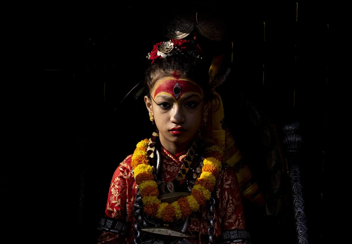Die lebende Göttin Kumari Niharika Bajracharya sitzt auf dem traditionellen Thron der Kumari und wartet auf Besucher während des traditionellen Matya-Festes in Ratnakar Mahavihar in Patan, Nepal.