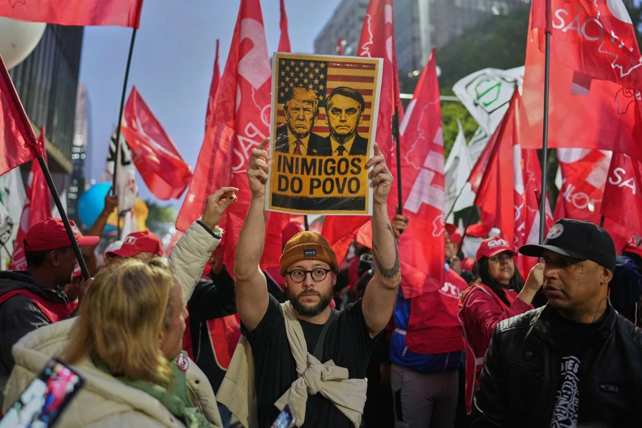Protest in Sao Paulo gegen Trumps politische Einmischung in die brasilianische Politik. Trump hat in einem Brief an die brasilianische Regierung Zollzuschläge von 50 Prozent auf brasilianische Exporte in die USA angedroht, falls Brasilien die angebliche «Hexenjagd» gegen den früheren Präsidenten Jair Bolsonaro nicht einstelle. Gegen Bolsonaro läuft ein Justizverfahren wegen eines versuchten Staatstreichs. Anhänger Bolsonaros hatten im Januar 2023 das Regierungsgebäude in der Hauptstadt Brasilia gestürmt und Zerstörungen angerichtet, um eine Machtübergabe an den Wahlsieger Lula da Silva zu verhindern. Sie behaupteten, Bolsonaro habe die Wahl gewonnen. Der Text auf dem Protestplakat mit den Portraits von Trump und Bolsonaro lautet auf portugiesisch: «Feinde des Volkes».