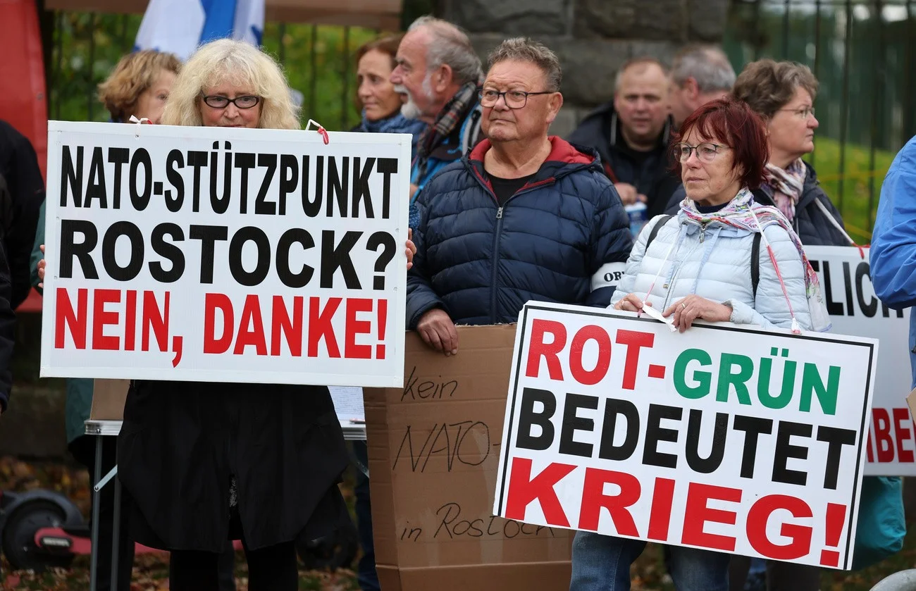 In Rostock, der grössten Stadt des ostdeutschen Bundeslandes Mecklenburg-Vorpommern, ist am Montag ein neues Hauptquartier für maritime Operationen von Nato-Seestreitkräften eingeweiht worden. Gegen dieses Projekt demonstrieren Bürger, die offenkundig die Beteiligung Deutschlands am Nato-Verteidigungsbündnis grundsätzlich ablehnen. Die Parole gegen Rot-Grün soll anscheinend als Protest gegen die deutsche Waffenhilfe für die von Russland überfallene Ukraine verstanden werden.