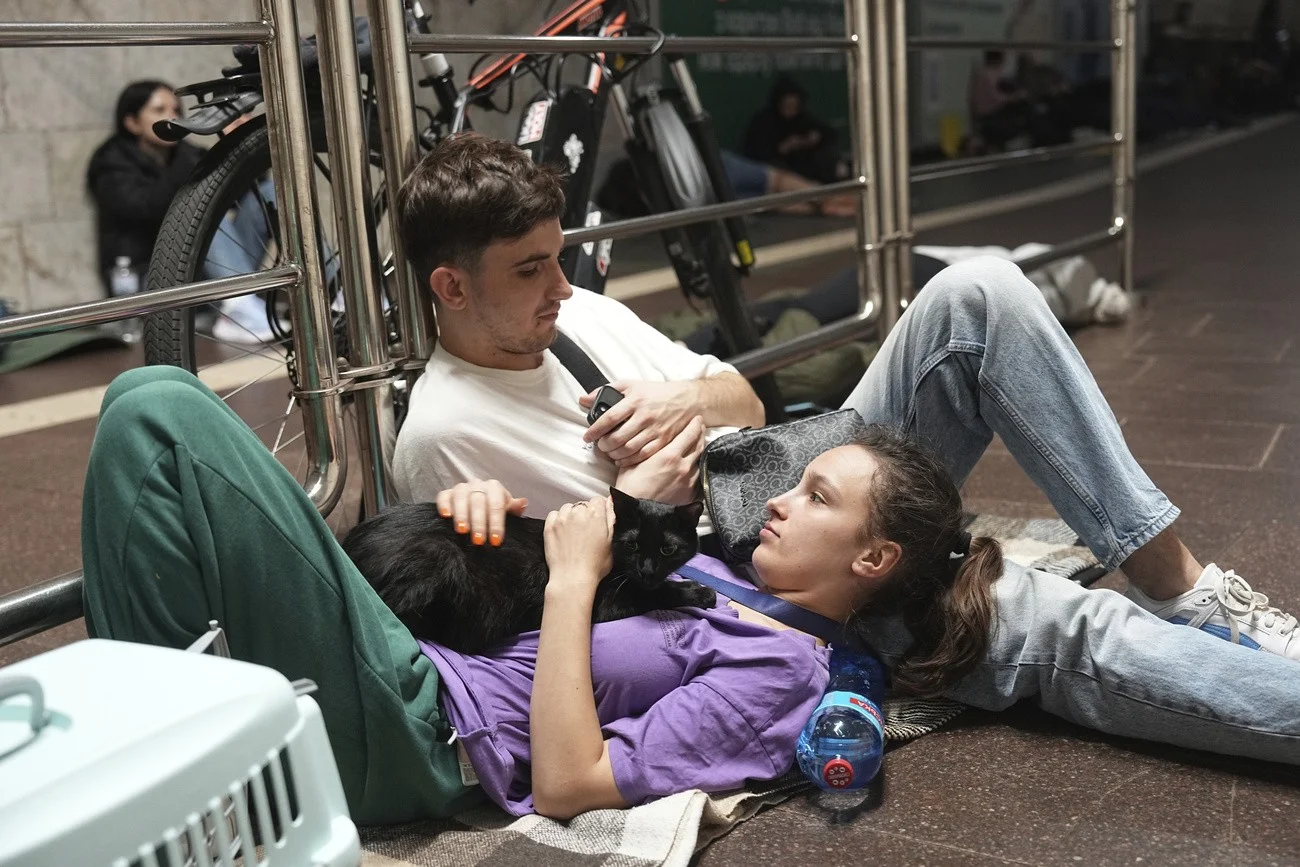 Russland lanciert die bisher umfangreichsten Drohnenangriffe gegen die Ukraine. Am Mittwoch schickte es 728 Drohnen (darunter auch Attrappen) – deutlich mehr als beim bisherigen Höchstwert in der vergangenen Woche. Die Zivilbevölkerung leidet immer mehr. Im Bild ein junges Paar, das am frühen Donnerstagmorgen in einer Metrostation in Kiew Schutz sucht.