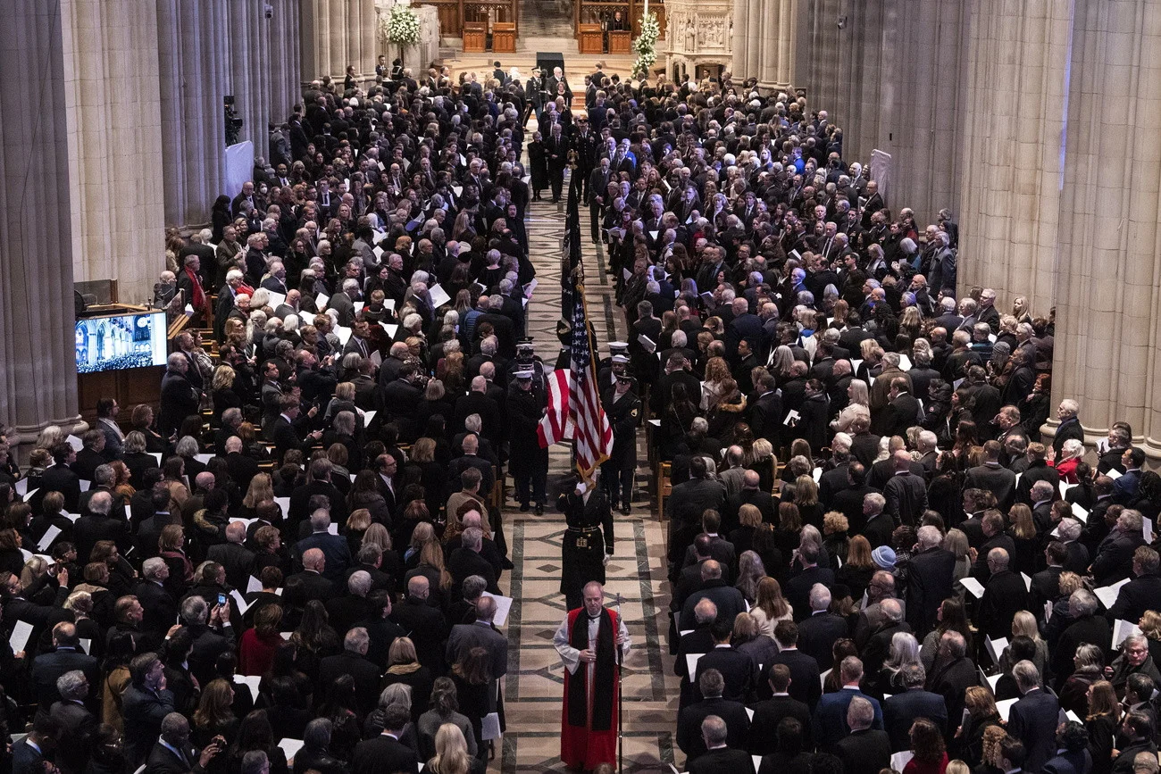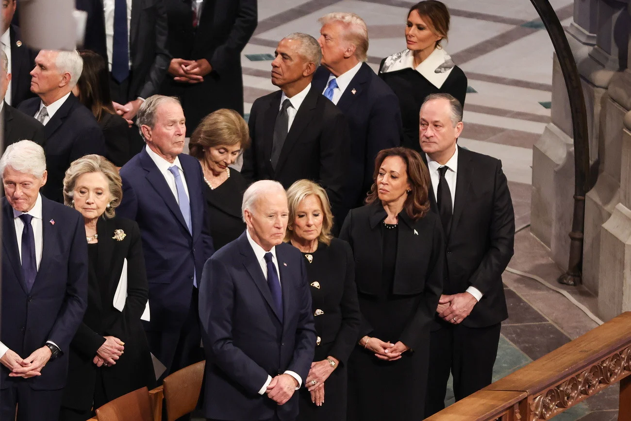 Tête-à-tête in der Washingtoner National Cathedral. Donald Trump richtet das Wort an Barack Obama. Was er sagt, ist nicht bekannt. Obama starrt vor sich hin; die beiden mögen sich gar nicht, aber wurden vom Protokoll zusammengesetzt. Die Trauerrede hielt Präsident Joe Biden.