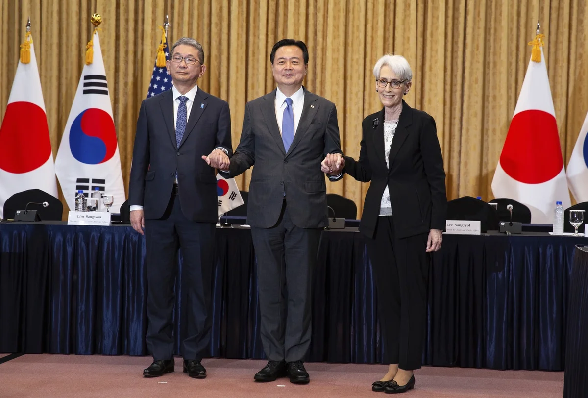 Stille Diplomatie im Schatten der Grosskonflikte: der Vize-Aussenminister Japans, Takeo Mori, der Vize-Aussenminister von Südkorea, Cho Hyun-dong, und deren amerikanische Amtskollegin Wendy Sherman bei einem Treffen am 8. Juni im Aussenministerium in Seoul. (Foto: Keystone/Pool Photo via AP/Jeon Heon-Kyun)