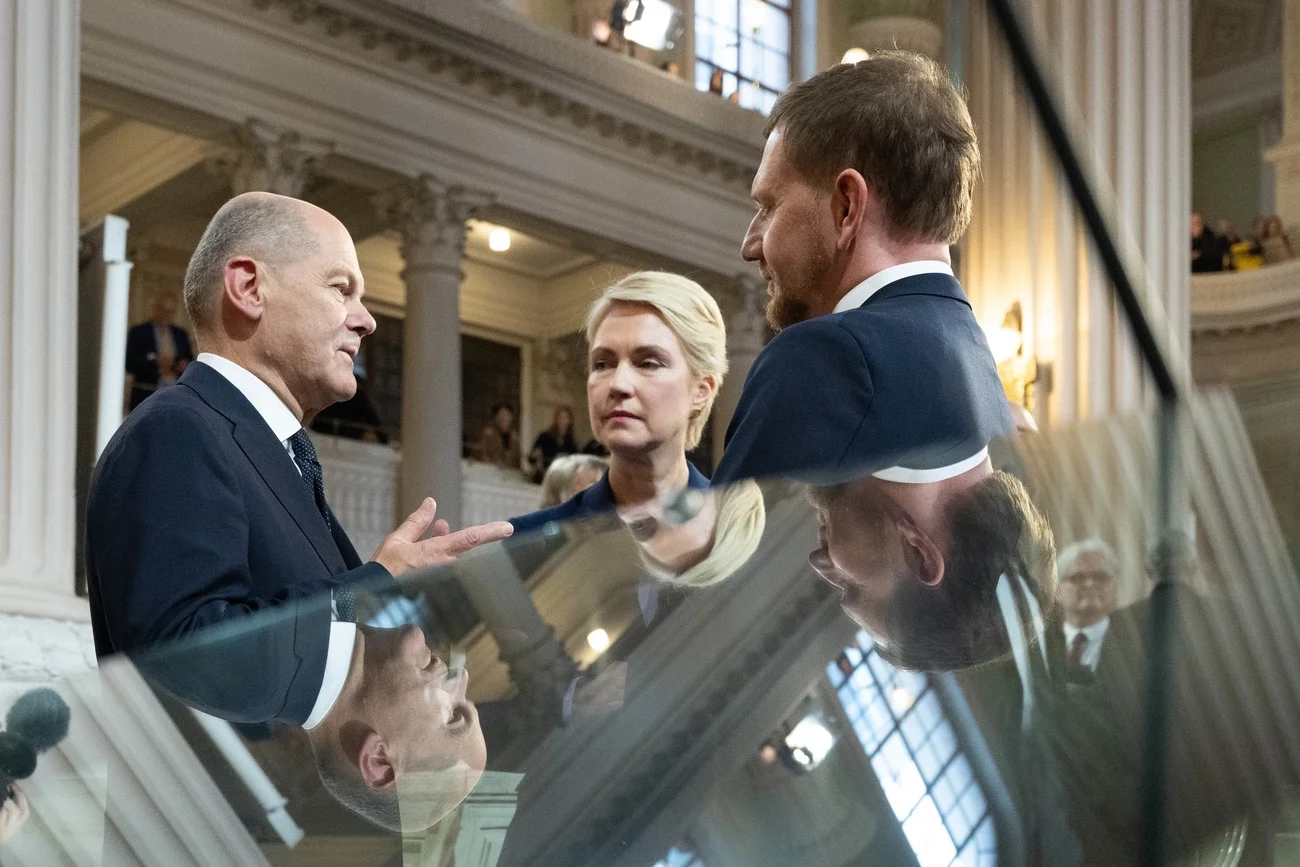 Vor 35 Jahren, am 9. Oktober 1989, begann mit dem Friedensgebet in der Nikolaikirche und der anschliessenden Demonstration von 70’000 Menschen auf den Strassen Leipzigs die Wende. Bundeskanzler Olaf Scholz, Manuela Schwesig, Bundesratspräsidentin und Ministerpräsidentin von Mecklenburg-Vorpommern, und Michael Kretschmer, Ministerpräsident von Sachsen, stehen vor Beginn einer Andacht am Abend des 9. Oktober 2024 in der Nikolaikirche beisammen.