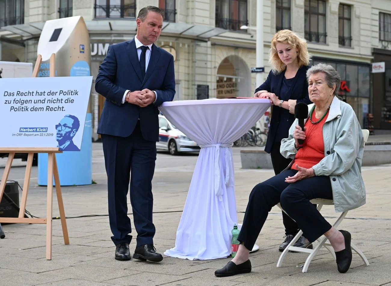 «Wach nicht auf mit fünf Jahren Kanzler Kickl», so warnen die österreichischen Sozialdemokraten vor einem Wahlsieg des rechtsnationalen FPÖ-Chefs Herbert Kickl. Am Sonntag finden in Österreich Parlamentswahlen statt. Laut Umfragen könnte die FPÖ zur stärksten Partei werden. Im Bild: SPÖ-Chef Andreas Babler am Donnerstag mit zwei Vertreterinnen seiner Partei an einem Wahlkampfstand in Wien.