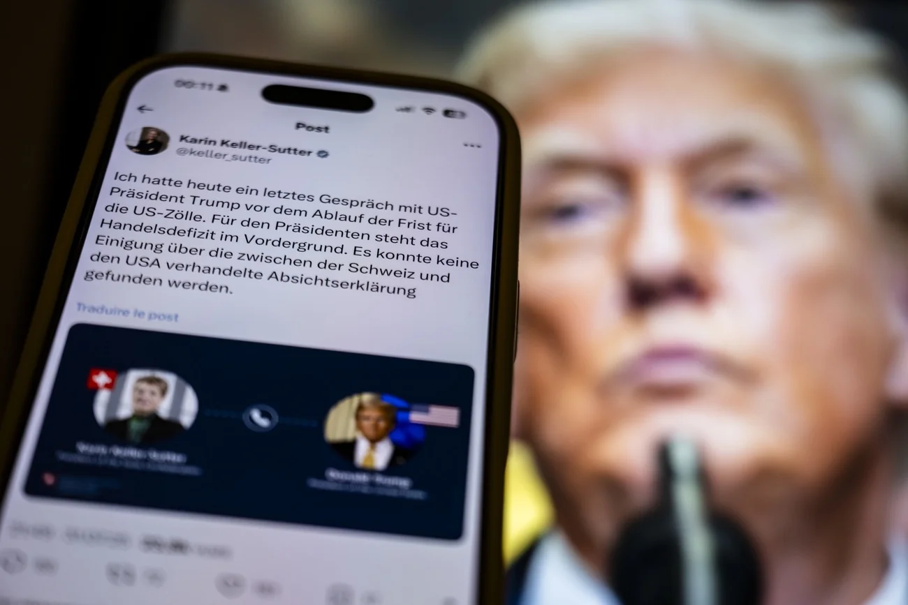 Das Bild zeigt die Nachricht der Schweizer Bundespräsidentin vom Scheitern der Verhandlungen auf X vor einem Porträt von Präsident Trump. Dieser hat nach Ablauf der Frist für Länder ohne Handelsabkommen mit den USA per Dekret neue Strafzölle verhängt.