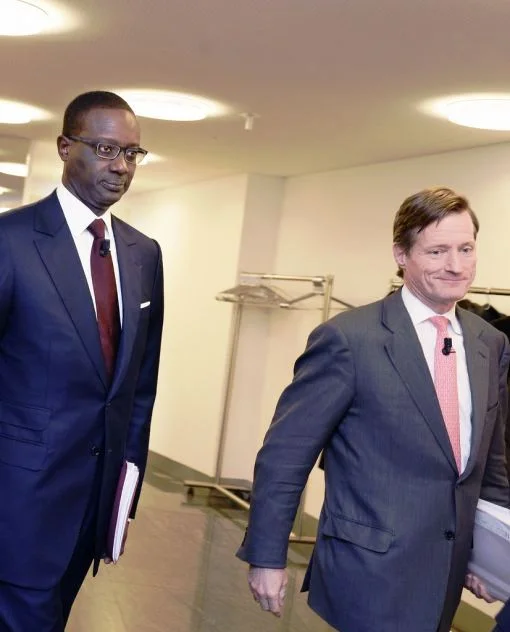 2015: Brady Dougan (rechts), der langjährige CEO der Credit Suisse tritt zurück. Sein Nachfolger ist der in der Côte d’Ivoire geborene und in Frankreich aufgewachsene Tidjane Thiam, bisher Chef von Prudential, der grössten britischen Versicherungsgesellschaft. (Foto: Keystone/Walter Bieri)
