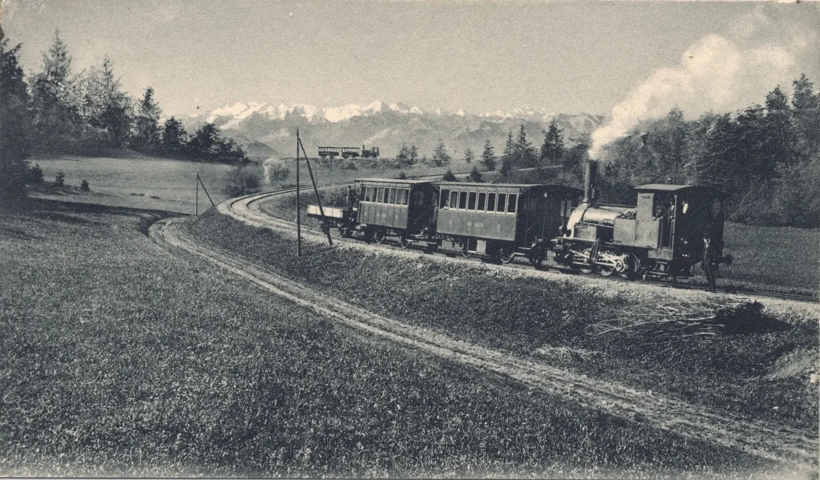 1875: In Zürich wird die gut neun Kiloemter lange Uetlibergbahn auf den Zürch Hausberg eingeweiht. Kleine Dampflokomotiven schoben zwei bis drei zweiachsige Personenwagen vom Bahnhof Selnau über die Steigung von beinahe 80 Promille zum Gipfel des Zürcher Aussichtsberges empor. Mit Dampflokomotiven fuhr die Bahn bis 1920.