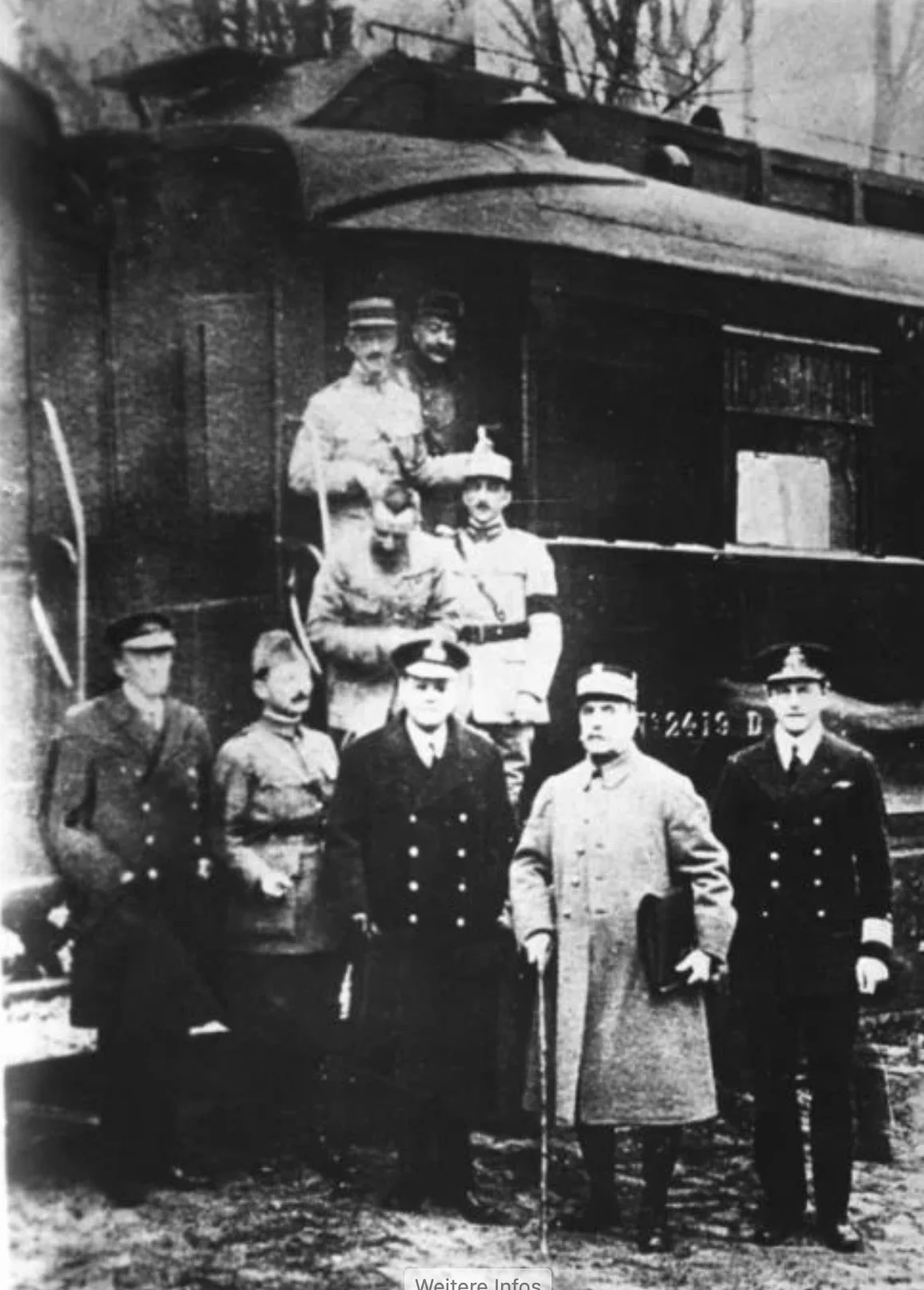 Während die Revolution tobt, unterzeichnen in einem Eisenbahnwagen im Wald von Compiègne, nordöstlich von Paris, Deutschland, Frankreich und Grossbritannien einen Waffenstillstand. Der französische Marschall Foch überbringt den Deutschen die Bedingungen. Diese sehen eine Entwaffnung Deutschlands und eine Räumung aller von Deutschen besetzten Gebiete, einschliesslich Elsass-Lothringens vor. Deutschland wird die Alleinschuld am Krieg angelastet und zu hohen Reparationszahlungen verpflichtet. Im Bild: Marschall Ferdinand Foch (vordere Reihe, zweiter von rechts) vor seinem Salonwagen im Wald von Compiègne, November 1918 (Bild: Deutsches Bundesarchiv, Bild 146-1987-038-29) Die Nazis sprechen 1940 von «wahnwitzigem Siegerübermut» der Siegermächte. Foch habe dem deutschen Volk eine «schwere Demütigung» zugefügt, «indem er ihm die schmachvollsten Waffenstillstandsbedingungen auferlegte, die die Welt jemals gekannt hat».