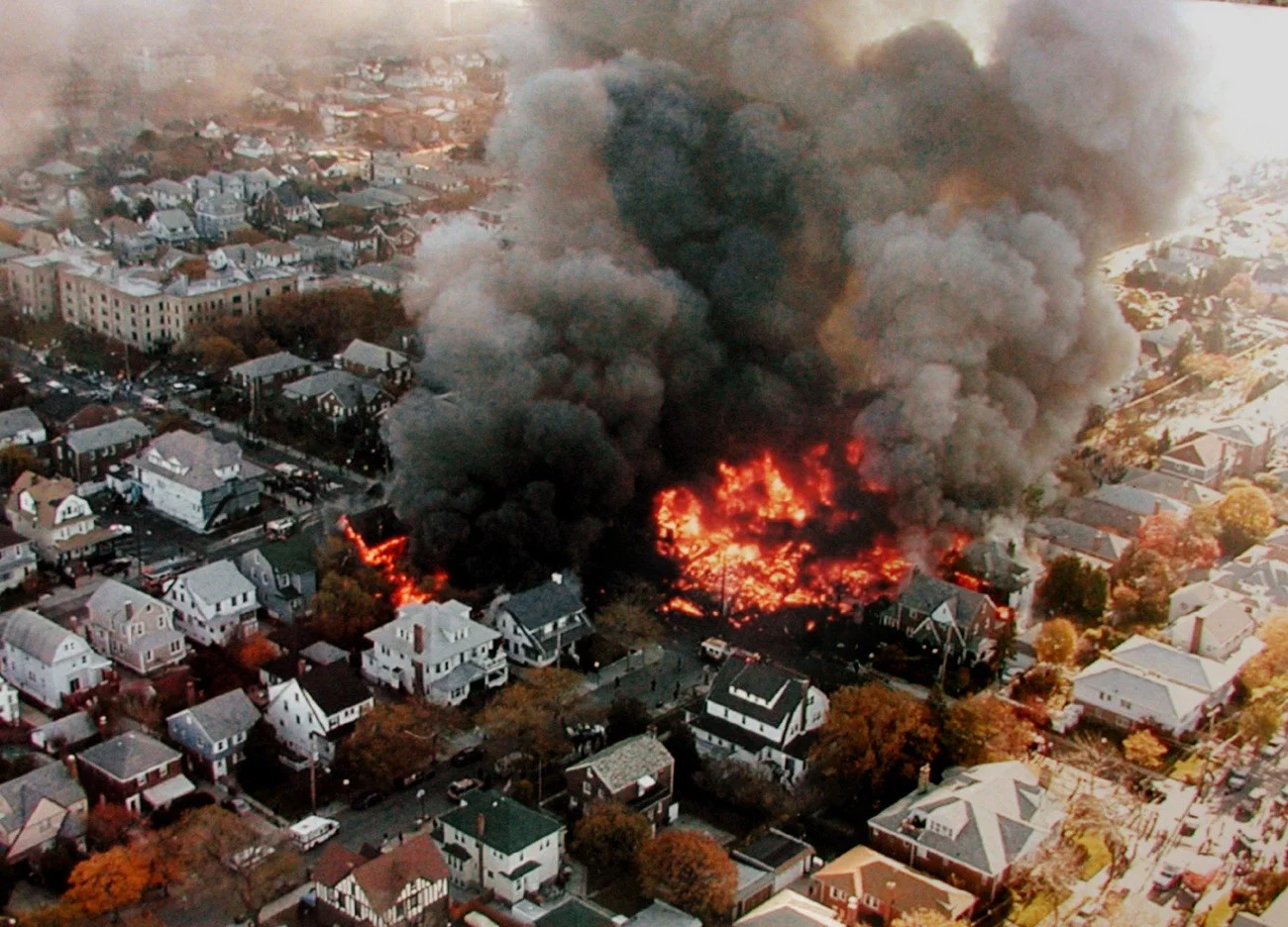Ein Airbus A300 der American Airlines stürzt ins New Yorker Stadtgebiet Queens. Die Maschine hatte sich auf dem Flug vom John F. Kennedy-Airport nach Santo Domingo befunden. Alles 260 Insassen sowie fünf Menschen am Boden sterben. Ursache des Unglücks ist eine Fehlreaktion des Co-Piloten. (Foto: Keystone/AP/New Yorker Polizei)