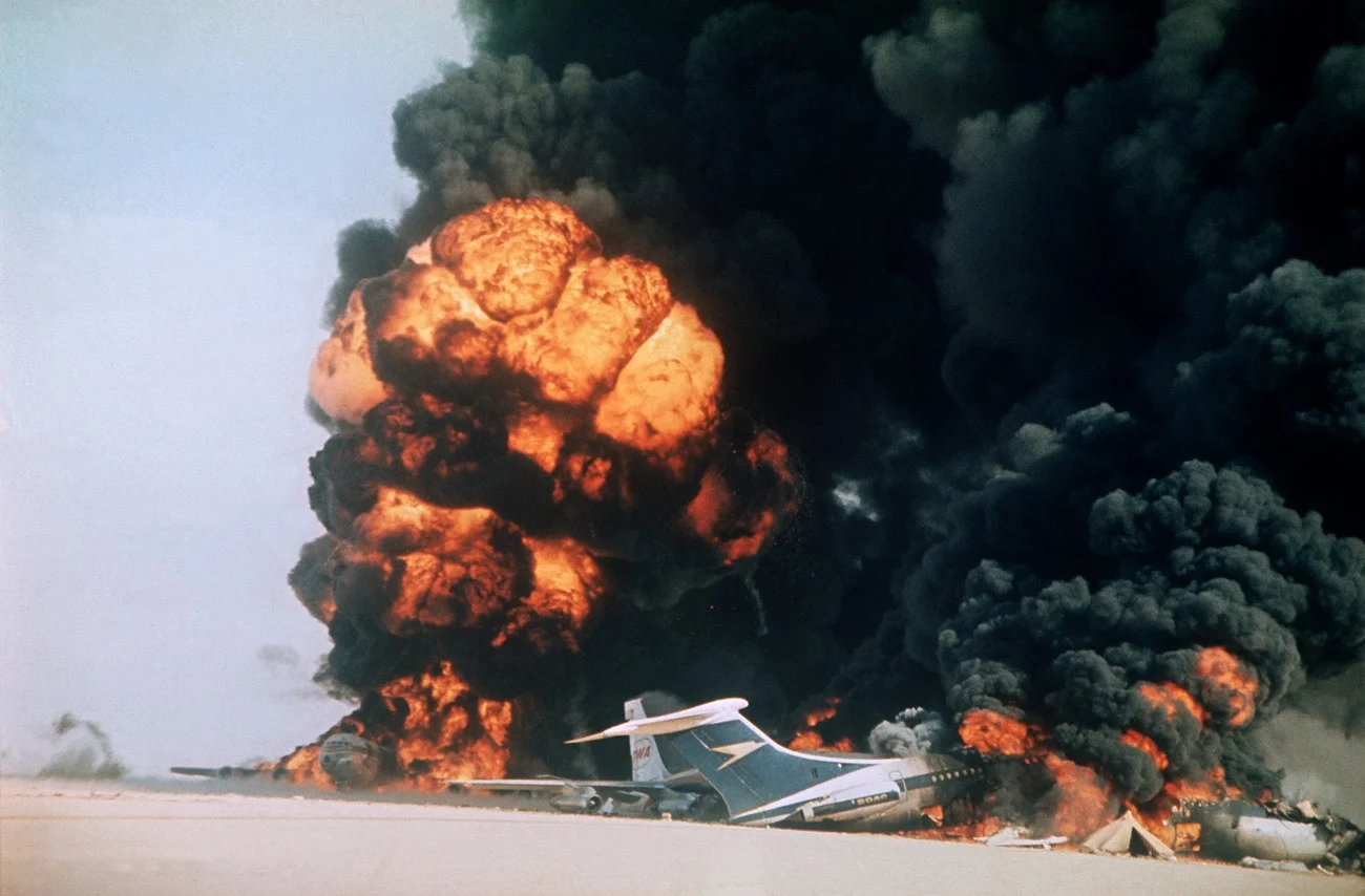 1970: Bewaffnete Mitglieder der Volksfront für die Befreiung Palästinas sprengen in der jordanischen Wüste bei Zerka eine DC-8 der Swissair sowie Maschinen der TWA und der BOAC (siehe oben).