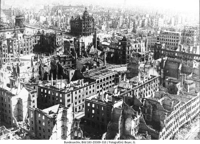 1945: Beginn der alliierten Luftangriffe auf Dresden. Die Innenstadt wird völlig zerstört.