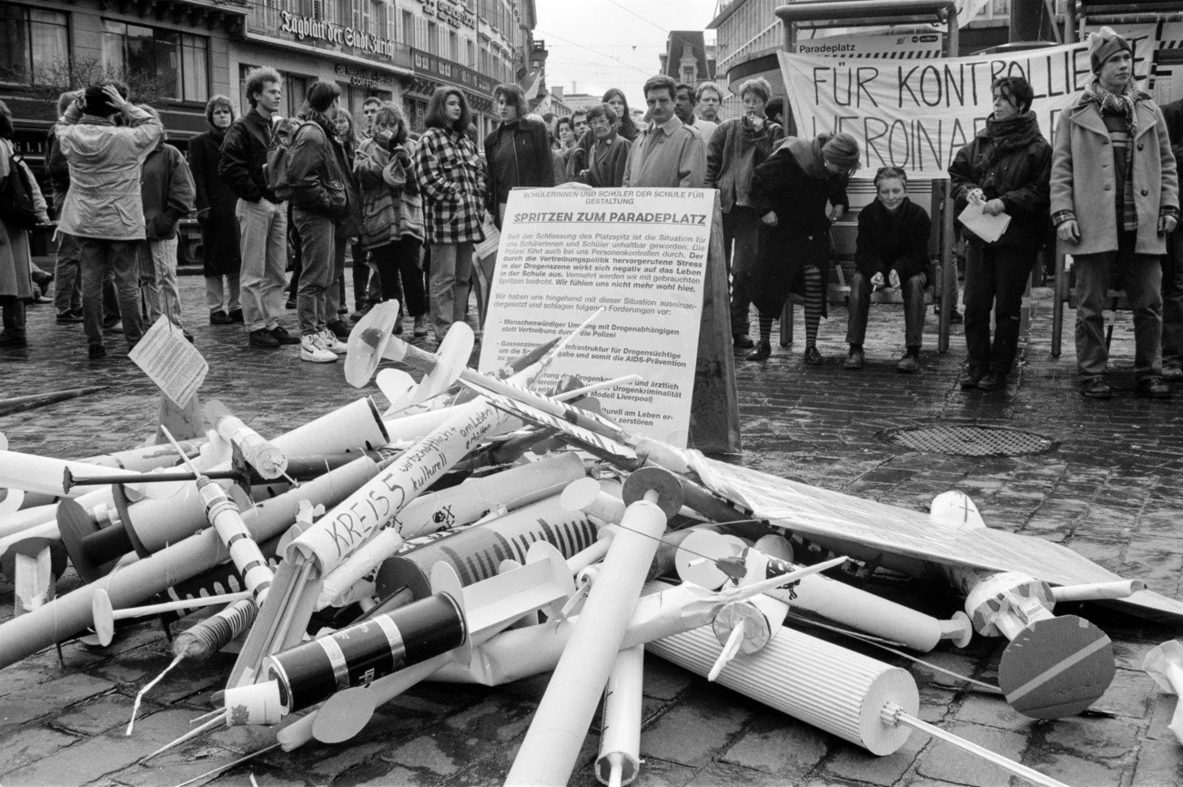 In der Schweiz beginnt die staatlich kontrollierte Heroinabgabe an Schwerstsüchtige. In den Genuss der Abgabe kommen vorerst 250 Schwerstabhängige. Mit der bundesrätlichen Massnahme hat die Zahl der Todesfälle von Drogensüchtigen und die Drogenkriminalität in der Schweiz stark abgenommen. Eine Demonstration der Studenten und Studentinnen der Schule für Gestaltung am Paradeplatz in Zürich für kontrollierte Heroinabgabe und gegen die momentane Drogenpolitik, aufgenommen am 25. Maerz 1992. (Keystone/Str)