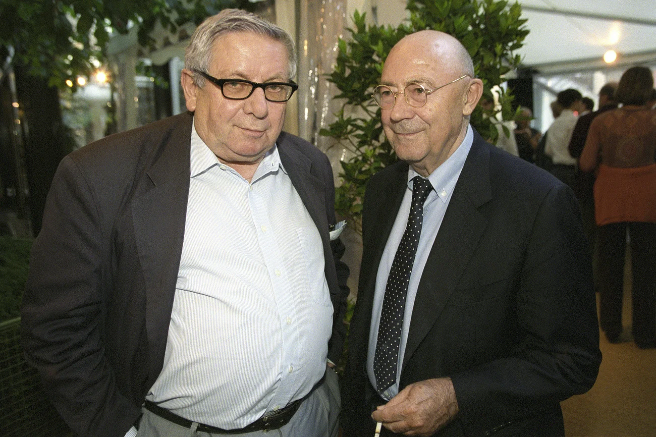 Der Gründer des Diogenes Verlages stirbt mit 81 Jahren. Die Schweiz verliert eine der wichtigsten Persönlichkeiten im Literaturbetrieb. Das Bild zeigt ihn (rechts) mit dem Schweizer Schriftsteller Hugo Lötscher am 1. Juni 2002 in Zürich (Keystone/Martin Rütschi),