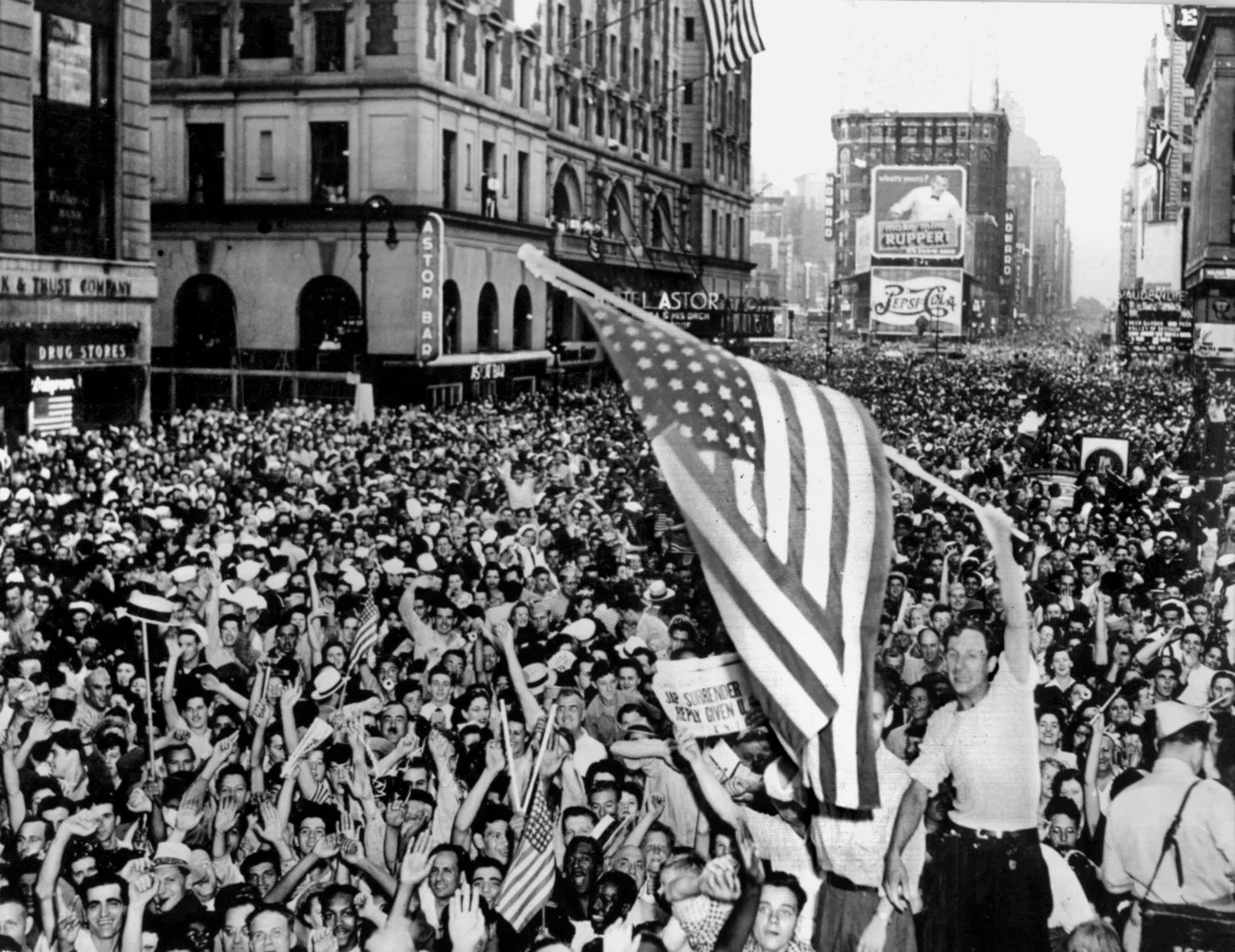 Der japanische Kaiser Hirohito gibt nach dem Abwurf der Atombomben auf Hiroshima und Ngasaki die bedingungslose Kapitulation Japans bekannt und fordert ein sofortiges Ende der japanischen Kampfhandlungen. Damit geht der Zweite Weltkrieg, die grösste militärische Auseinandersetzung in der Geschichte der Menschheit, zu Ende. Bild: In New York brechen riesige Freudenkundgebungen aus. (Foto: Keystone/Photopress-Archiv)