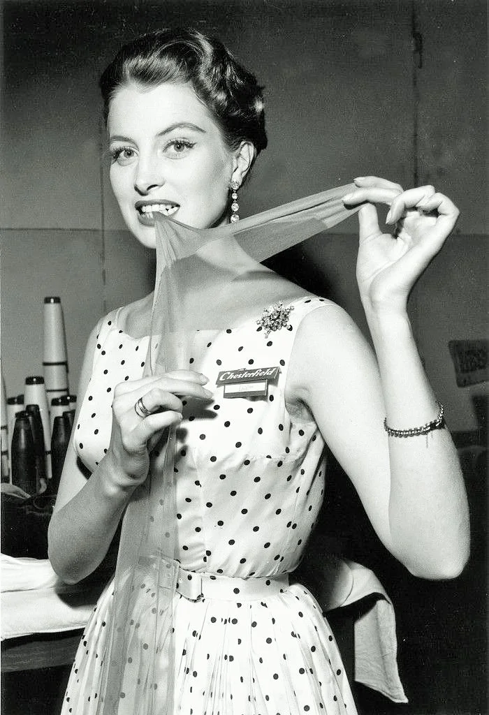 1940: «N-Day» in den USA. Der Chemiekonzern DuPont wirft die ersten fünf Millionen Paar Nylonstrümpfe auf den Markt. Sie sind innerhalb weniger Stunden verkauft. Fünf Jahre zuvor hatte DuPont die erste Nylonfaser auf der Basis von Kohle, Luft und Wasser entwickelt. Die ersten Strümpfe hatten eine bis zu 15 Mal dickere Garnstärke als heute. Auf dem Bild vom 26. März 1953 demonstriert das französische Mannequin Capucine, dass die neuen Strümpfe auch «bissfest» sind. (Foto: Keystone/Rue des Archives/Agip)
