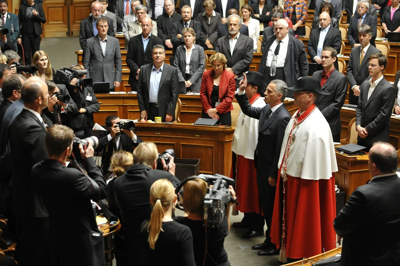 Der 49-jährige Neuenburger freisinnige Ständerat wird von der Vereinigten Bundesversammlung zum Nachfolger des abtretenden Pascal Couchepin gewählt. Zuerst ist er Vorsteher des Departements des Innern, ab 2015 leitet er das Aussenministerium. 2014 ist er Bundespräsident. Im Bild: Burkhalter legt nach seiner Wahl den Amtseid ab. Im Juni 2017 gibt er seinen Rücktritt per Ende Oktober 2017 bekannt. (Foto: Keystone/Peter Schneider)