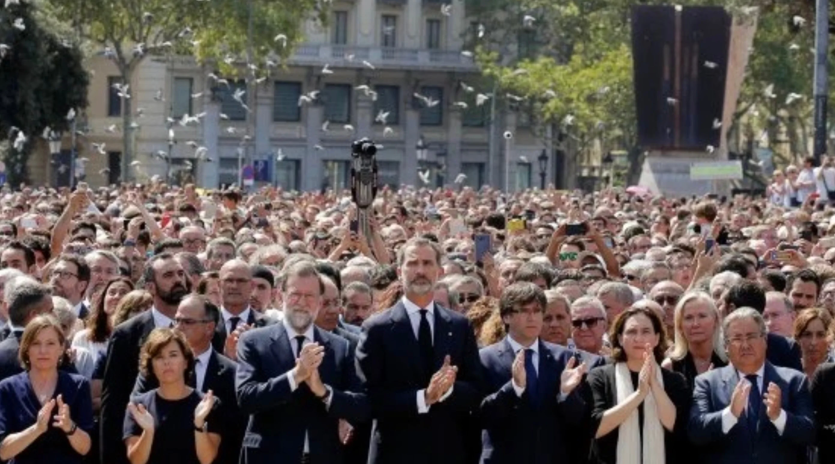 Schweigeminute nach den Anschlägen in Barcelona und Cambrils: Von Links: Die spanische Vizepremierministerin Soraya Saenz de Santamaria, Premierminister Mariano Rajoy, König Felipe VI., Kataloniens Regionalpräsident Carles Puigdemont, Barcelonas Bürgermeisterin Ada Colau und Spaniens Innenminister Juan Ignacio Zoido. In Barcelona war ein Lieferwagen auf der Flaniermeile «Las Ramblas» in die Menschenmenge gefahren. 13 Menschen wurden getötet, über 100 verletzt. Dem Fahrer gelang die Flucht zu Fuss. Im etwa 100 Kilometer südlich von Barcelona gelegenen Cambrils fuhr wenige Stunden später ein Personenwagen in eine Gruppe Fussgänger. Eine Frau starb, sieben Menschen wurden verletzt, darunter ein Polizist. Der «Islamische Staat» reklamiert die Verantwortung für die Anschläge. (Foto: Keystone/EPA)