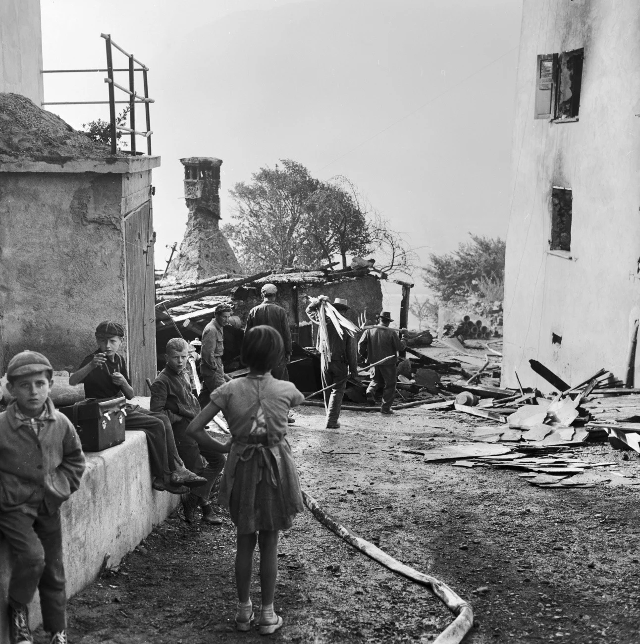 Das Walliser Dorf oberhalb von Riddes und Saillon wird bei einer Brandkatastrophe teilweise zerstört. 45 Personen werden obdachlos. Am 13. September des gleichen Jahres zerstört ein weiterer Grossbrand die restlichen vom ersten Brand verschonten Häuser. (Foto: Keystone/Photopress-Archiv/Alain Gassmann)