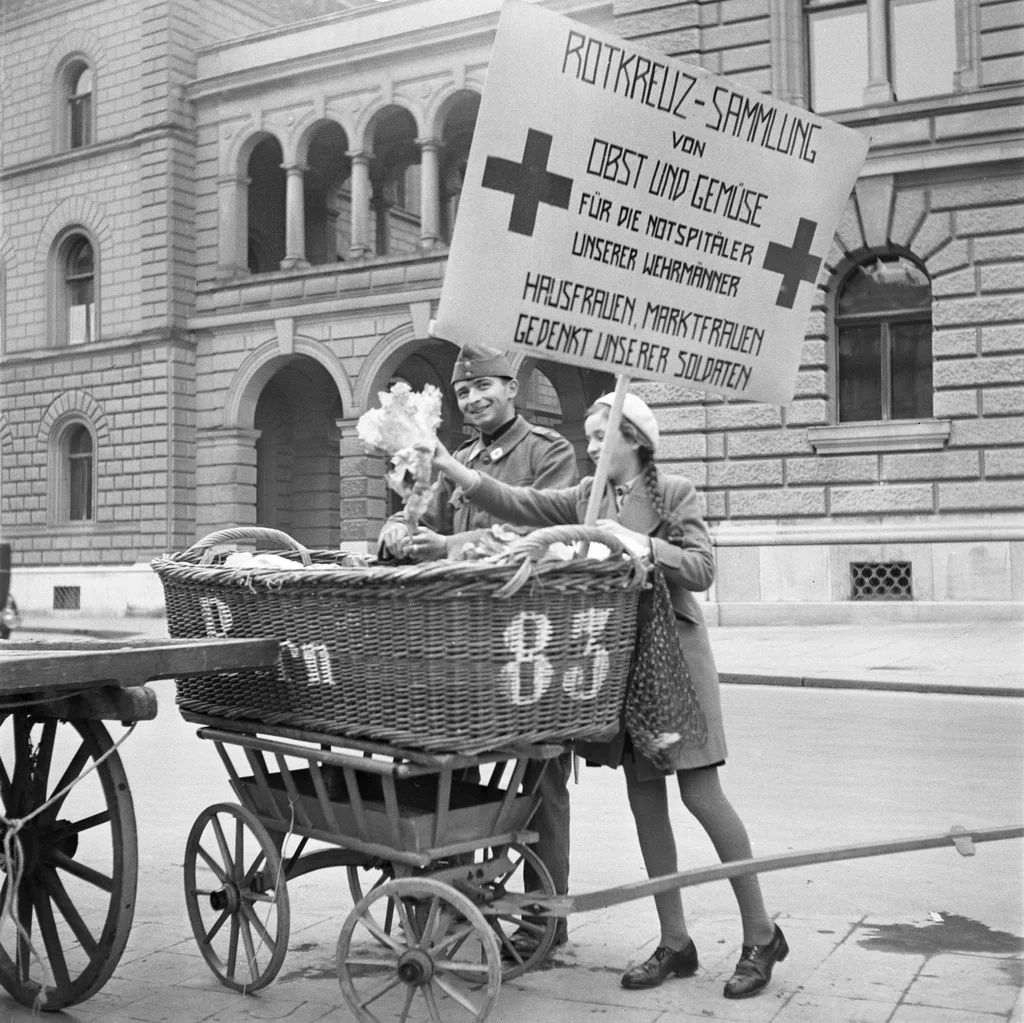 Initianten sind Bundesrat Jakob Dubs und die Genfer IKRK-Mitglieder Gustave Moynier und Guillaume-Henri Dufour. Die Organisation nennt sich zunächst „Hülfsverein für schweizerische Wehrmänner und deren Familien". Das Bild aus dem Jahr 1939 zeigt eine vom Roten Kreuz organisierte Gemüsesammlung auf dem Berner Bundesplatz. (Foto: Keystone/Photopress-Archiv/Walter Henggeler)