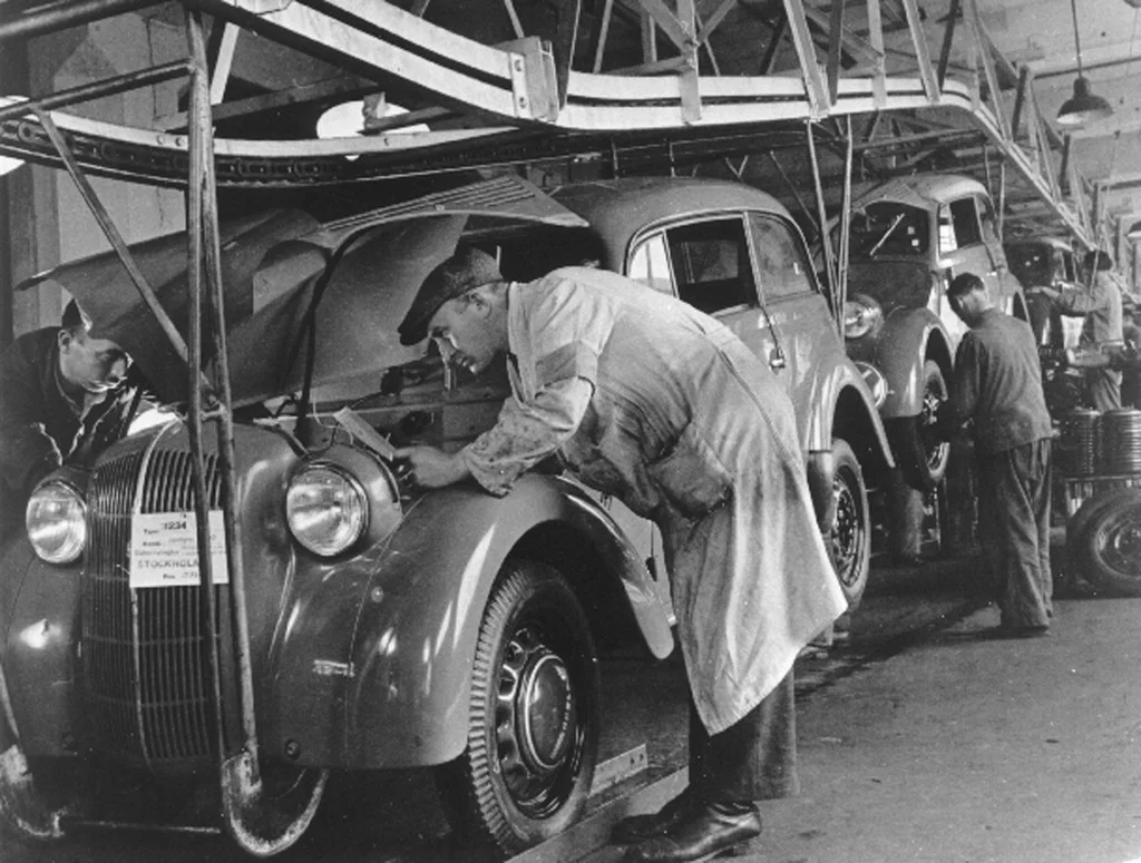Der grösste deutsche Automobilhersteller verkauft 80 Prozent der Unternehmensanteile an den amerikanischen Automobilkonzern General Motors (GM). 1931 übernimmt GM auch die restlichen 20 Prozent. Zu den ersten erfolgreichen Autos unter GM-Führung wird von 1934 bis 1936 der Opel Olympia gebaut. Das undatierte Bild zeigt die Montage der ersten Opel Kadett. Adam Opel hatte die Firma 1862 gegründet und produzierte vorerst Nähmaschinen und Velos. Am 6. März 2017 übernimmt der französische Autokonzern PSA (Peugeot/Citroen) die seit der Jahrtausendwende mit Verlust arbeitenden Opel-Werke. (Foto: Keystone/AP/HO)