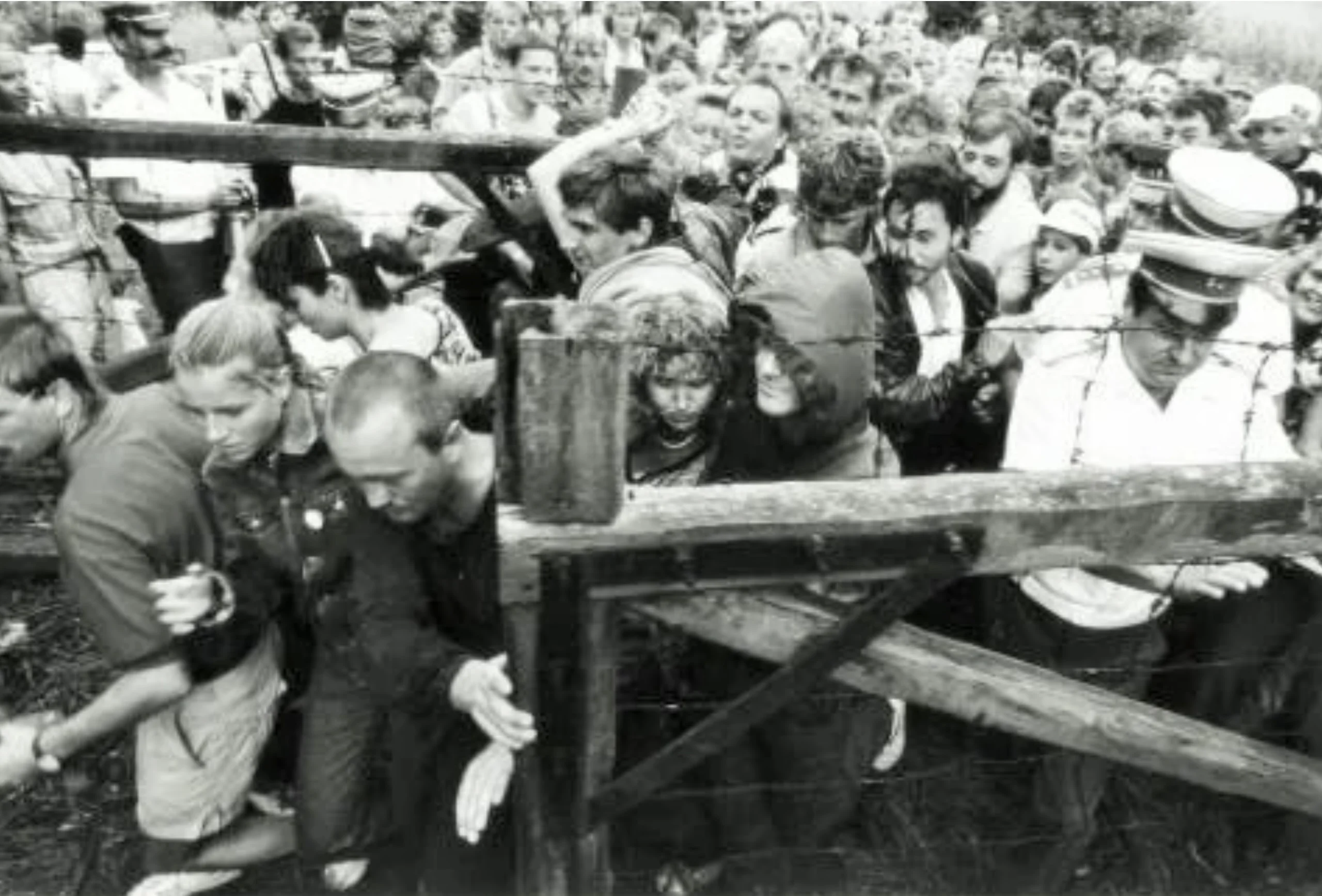 700 DDR-Bürgerinnen und -Bürger flüchten über die kurz geöffnete österreichisch-ungarische Grenze in den Westen. Mit Flugblättern sind sie auf das «Paneuropäische Picknick» aufmerksam gemacht worden. Dabei handelt es sich um eine Friedensdemonstration an der Grenze bei Sopron (Ödenburg). Ungarn und Österreich hatten vereinbart, die Grenze für drei Stunden symbolisch zu öffnen. Kurz nach der Öffnung wird das Grenztor aufgerissen und Hunderte vorwiegend junger DDR-Bürger rennen auf österreichischen Boden. Knapp drei Monate später fällt die Berliner Mauer. (Foto: Keystone/LAIF/Eisermann)