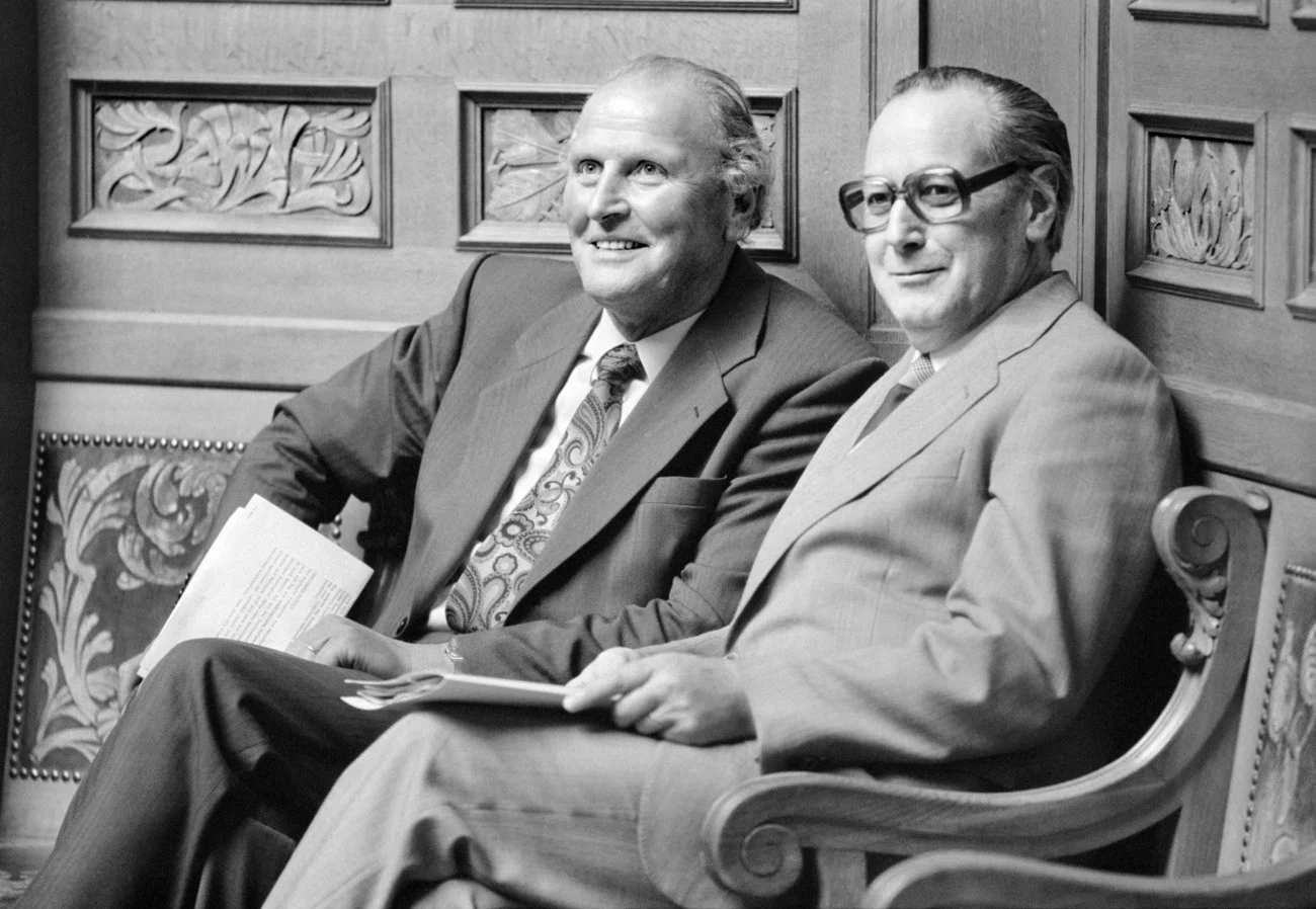 1994: Tod von Hans Hürlimann, Schweizer Bundesrat von 1973 bis 1982 (CVP/ZG). Er stand dem Departement des Innern vor. Anlässlich der Eröffnung des Gotthard-Strassentunnels im Jahr 1980 sagte er, der Tunnel werde «niemals ein Korridor für den Schwerverkehr werden». In seiner Amtszeit wurden die Sozialwerke (9. AHV-Revision, Drei-Säulen-Prinzip der Altersvorsorge) ausgebaut, der Umweltschutz und der Nationalstrassenausbau (u. a. Gotthardtunnel) vorangetrieben. Er setzte sich für eine Erweiterung der ETH und ein Hochschulförderungsgesetz ein. Das Historische Lexikon der Schweiz bezeichnet ihn als «aufgeschlossenen, sozial engagierten, wertkonservativen, katholischen Föderalisten und Staatsmann, ... der eine pragmatische, auf Konsens bedachte und dadurch erfolgreiche Politik betrieb». Im Bild: Hürlimann (rechts) mit Bundesrat Willi Ritschard am 30. September 1980 im Nationalratssaal. (Foto: Keystone/Str)