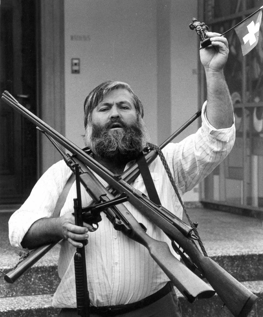 2001: Der Schweizer Rechtsextremist Marcel Strebel wird in Burgdorf erschossen. Strebel hatte 1989 im Zürcher Fernsehstudio für einen Eklat gesorgt. Zunächst bespuckte er eine dunkelhäutige Frau. In der Sendung «Zischtigclub» liess der Gründer der «Patriotischen Front» seinen rechtsextremen, rassistischen Tiraden freien Lauf. Er pöbelte gegen Ausländer, Juden und «Neger». «Neger gehören nach Afrika, nicht nach Europa». Er müsse die Schweiz von der «Ausrottung durch fremde Rassen» schützen. Die Sendung sorgte für einen TV-Skandal. Der Waffennarr wurde mehrmals wegen Anwendung von Gewalt zu Gefängnisstrafen verurteilt. In Burgdorf stürmte er alkoholisiert mit einem Pickel bewaffnet auf einen Gegner los. Dieser erschoss ihn in Notwehr. (Foto: Keystone/Str)