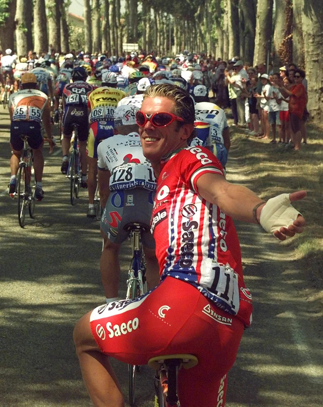 Der italienischer Radrennfahrer ist einer der besten Sprinter der 90er Jahre. In seiner Karriere erringt er 189 Siege. Im Bild: Cipollini 1998 während der 9. Etappe der Tour de France in Montauban. (Keystone/AP/Laurent Rebours)