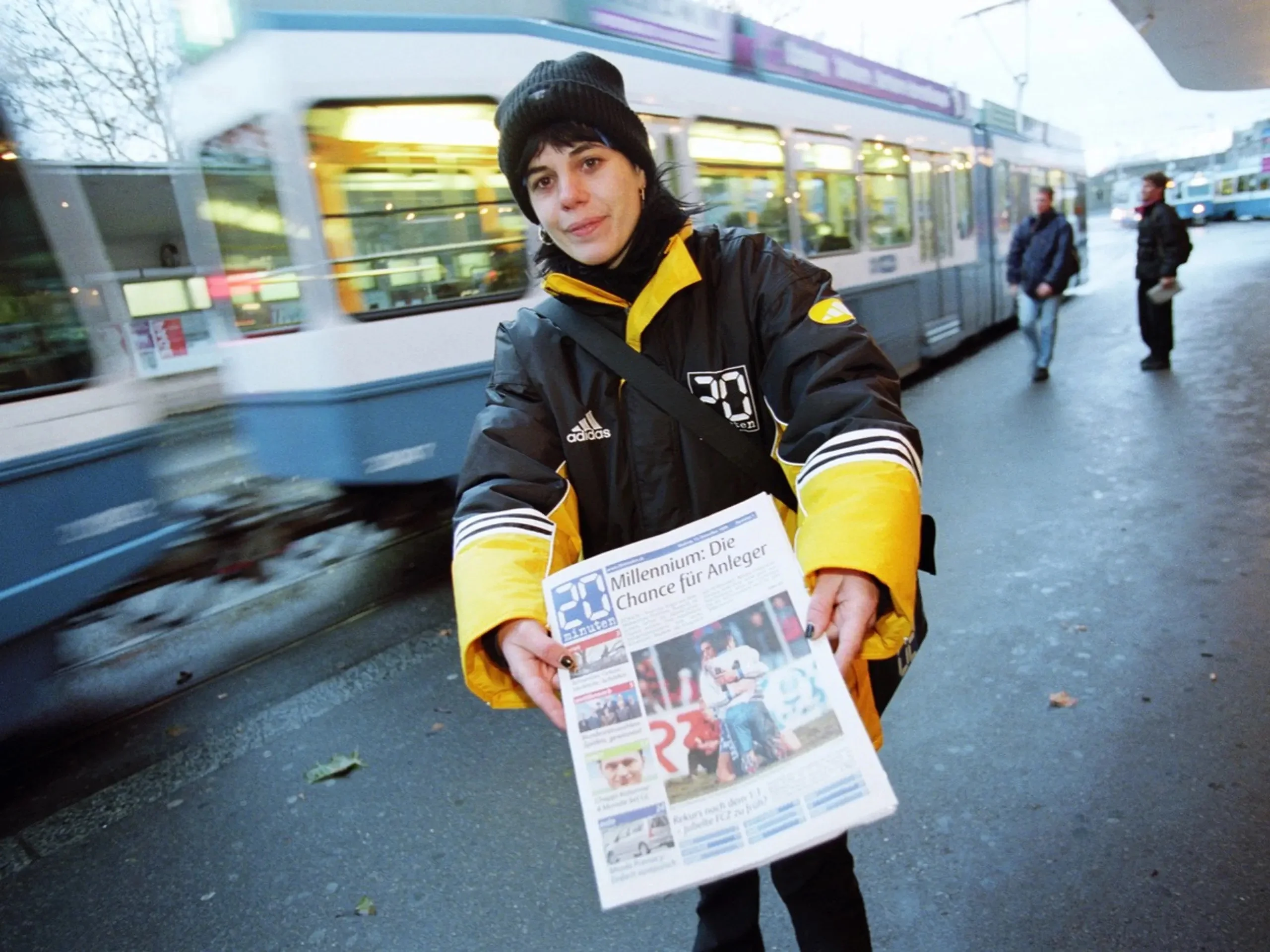 Die Pendlerzeitung erscheint zum letzten Mal. Zu Spitzenzeiten lagen in den Verteilboxen fast 600'000 Exemplare. Doch nach 26 Jahren ist Schluss. Künftig, so erklärt die Herausgeberin TX Group, wird es «20 Minuten» nur noch als App und als Webseite geben. Mit «20 Minuten» verschwindet die letzte gedruckte und kostenlose Schweizer Tageszeitung. Im Bild: Eine Verteilerin am Tag der Lancierung des Gratisblatts beim Bellevue in Zürich am 13. Dezember 1999. (Foto: Keystone/Christoph Ruckstuhl)