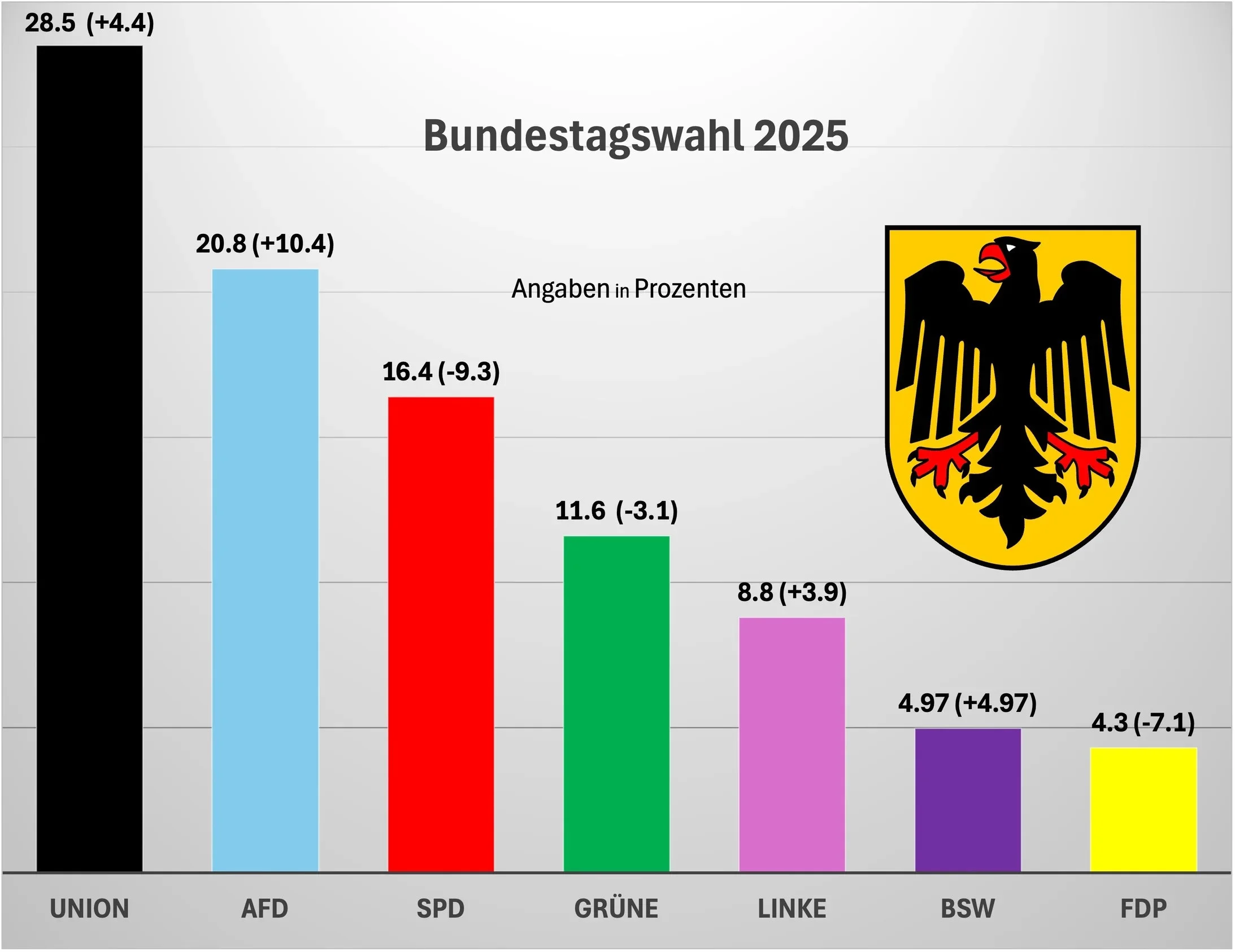 Die Union von Friedrich Merz gewinnt die Bundestagswahl erwartungsgemäss klar mit 28,5 Prozent der Stimmen. Die AfD kommt auf 20,8 Prozent, die SPD auf 16,4 Prozent, die Grünen auf 11,6 Prozent, die Linke auf 8,6 Prozent, das Bündnis Sahra Wagenknecht und die FDP verpassen den Einzug in den Bundestag.