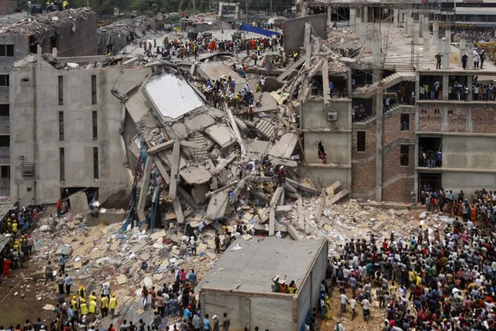 In Sabhar, 25 Kilometer nordwestlich von Dhaka, der Hauptstadt von Bangladesh stürzt ein achtstöckiges Gebäude ein, in dem sich Textilfabriken befinden. 1‘135 Menschen sterben, 2438 werden verletzt. Obwohl Risse im Gebäude festgestellt worden waren, wurden die Arbeiterinnen und Arbeiter gezwungen, die Arbeit aufzunehmen. (Foto: Wikipedia)