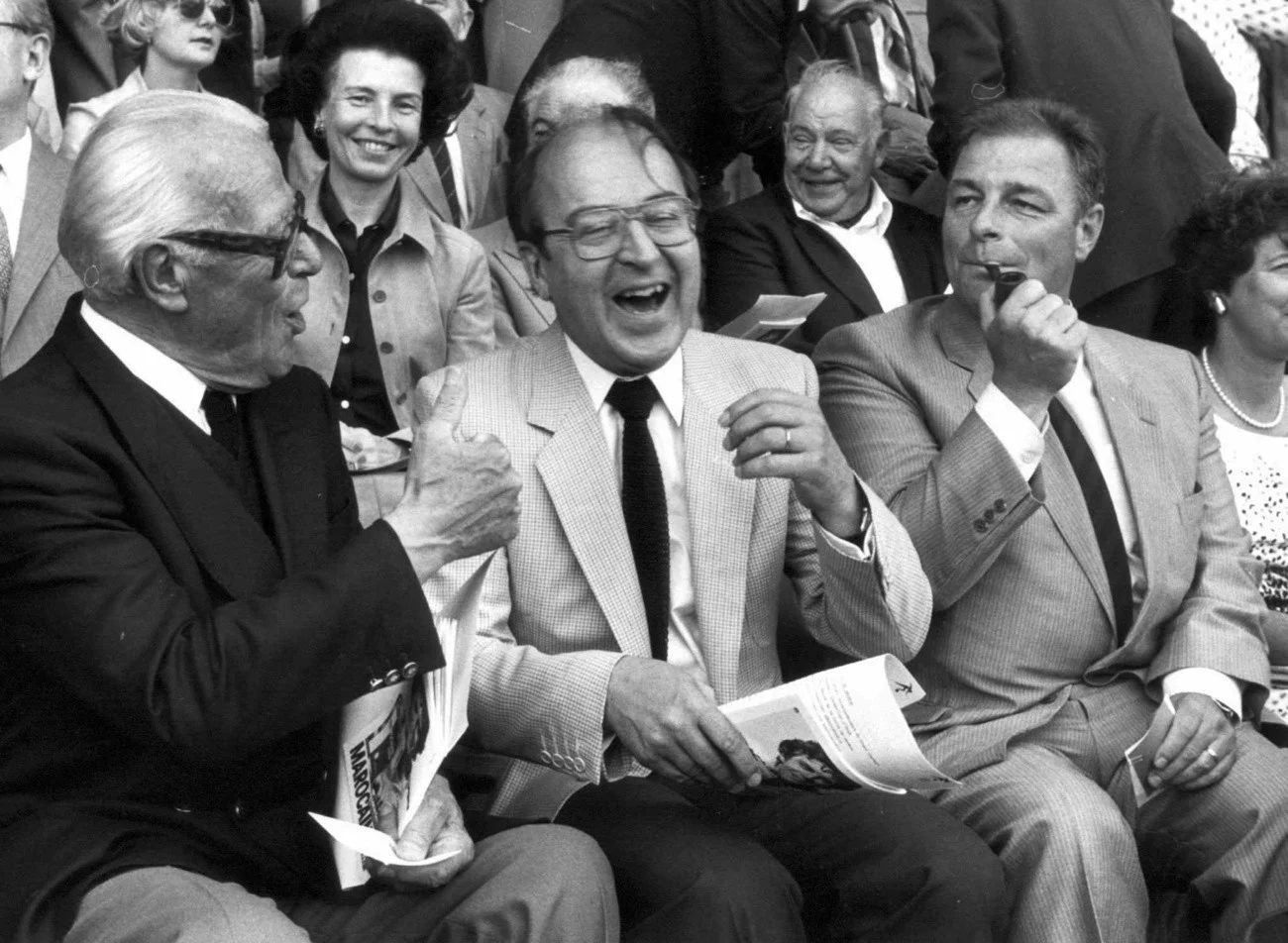 Furgler, Schweizer Bundesrat (CVP/SG) von 1972 bis 1986, ist zunächst Vorsteher des Justiz- und Polizeidepartements, später leitet er das Volkswirtschaftsdepartement. Er gilt als «Vater des Kantons Jura». In der «Lex Furgler» wird der Immobilienverkauf an Ausländer beschränkt. Furgler befürwortet den Verfassungsartikel zur Gleichberechtigung von Mann und Frau, der 1981 in einer Volksabstimmung gutgeheissen wird. Weiter strebt er eine Totalrevision der Bundesverfassung an, was scheitert. Er fördert eine Revision des Familienrechts, insbesondere des Kindesrechts und der Adoption. 1985 setzt er ein neues Eherecht durch. Keinen Erfolg hat er 1978 beim Versuch zur Schaffung einer Bundessicherheitspolizei. Bei der Abtreibungsfrage nimmt er im Gegensatz zum Gesamtbundesrat eine konservative Haltung ein. Seine Rolle bei der Verurteilung von Brigadier Jean-Louis Jeanmaire wegen Landesverrats wird zum Teil kritisiert. Furgler stirbt am 23. Juli 2008. Im Bild: Die Bundesräte Pierre Graber, Kurt Furgler und Jean-Pascal Delamuraz 1984 während des Cupfinals Servette gegen Lausanne in Bern (Keystone/Str)