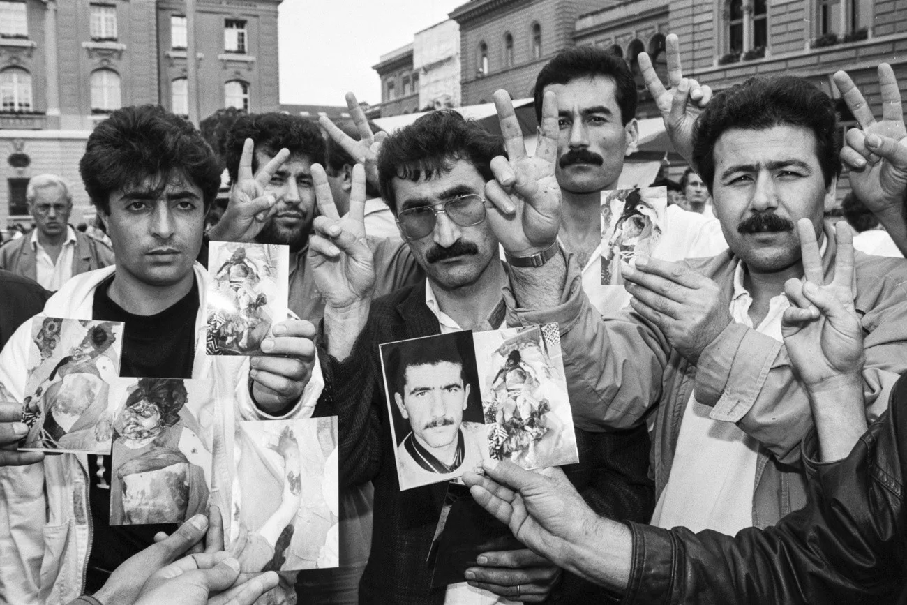 Aus der türkischen Botschaft in Bern schiessen drei Botschaftsangestellte mit scharfer Munition auf etwa 150 kurdische Demonstranten, die sich Zugang zum Botschaftsgelände verschafft hatten und Steine, Petarden und Farbbeutel gegen das Botschaftsgebäude schleuderten. Ein 29-jähriger Kurde wurde erschossen. Acht Demonstranten wurden teils schwer verletzt. Der Zwischenfall löste eine schwere Verstimmung zwischen der Schweiz und der Türkei aus. Im Bild: Kurden und Kurdinnen demonstrieren auf dem Bundesplatz in Bern, verurteilen die Schiesserei und verlangen Freilassung kurdischer Gefangenen in der Türkei. (Foto: Keystone/Edi Engeler)