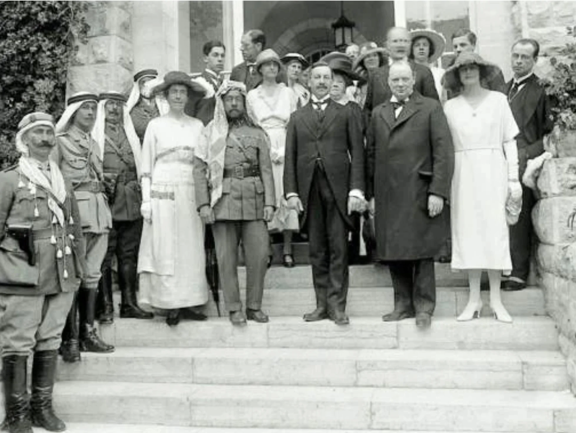 Abdallah ibn Husain I. (oder Abdallah I.) nimmt den Königstitel an. Das Bild wurde 1921 in Jerusalem aufgenommen. Es zeigt (in der Mitte) Sir Herbert Samuel, den ersten Hochkommissar in Palästina, einem britischen Völkerbundsmandat. Links von Samuel der spätere König Abdallah. Rechts im Bild Churchill mit seiner Frau. Jordanien nimmt 1948 und 1949 am arabischen Krieg gegen Israel teil und annektiert die eroberten Gebiete auf der Westbank in Palästina. Wegen seiner gemässigten Haltung gegenüber Israel wird der König am 20. Juli 1951 in der al-Aqsa-Moschee von einem palästinensischen Extremisten erschossen. (Foto: Library of Congress, Washington)