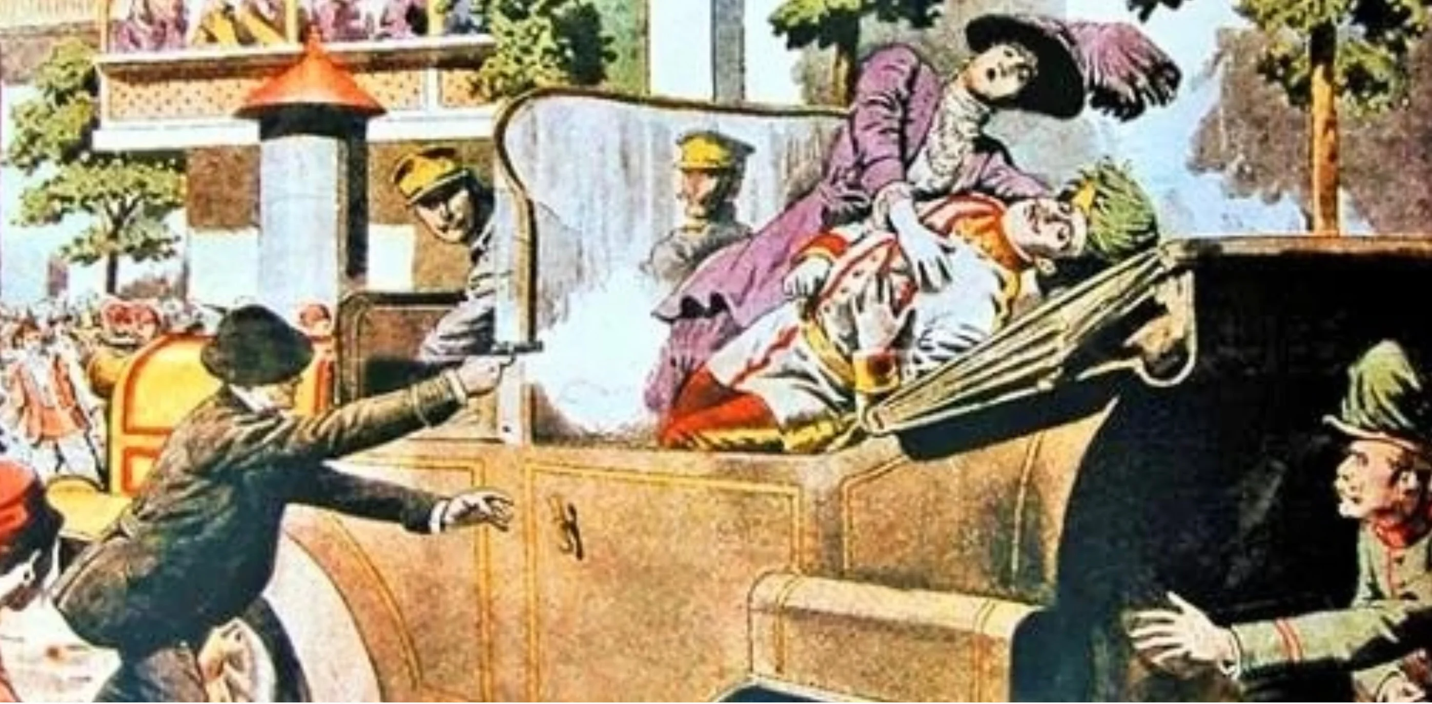 Mitglieder der bosnischen Studentenorganisation Mlada Bosna töten den österreichischen Erzherzog und Thronfolger Franz Ferdinand. Die Attentäter kämpfen für eine Befreiung Bosnien-Herzegowinas von der österreichisch-ungarischen Herrschaft. (Zeitgenössische Illustration). Das Attentat gilt als Initialzündung für den Ersten Weltkrieg.