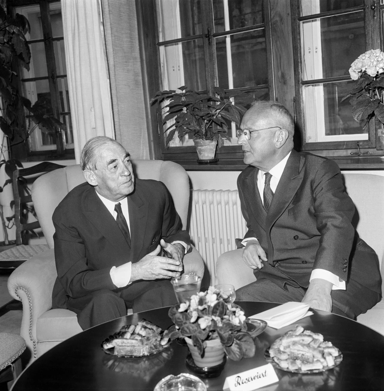 Er gehört zu den berühmtesten Architekten und Designern des letzten Jahrhunderts. («Finlandia-Halle» in Helsinki, 1962, «Heilig-Geist-Kirche» in Wolfsburg 1962), Designer (Sessel «Paimio» 1929, «Aalto-Vase» 1936). Im Mai 1954 besucht Aalto (links) den Stadtpräsidenten von Zürich, Emil Landolt. Alvar Aalto stirbt am 11. Mai 1976 in Helsinki. (Foto: Keystone/Photopress-Archiv)