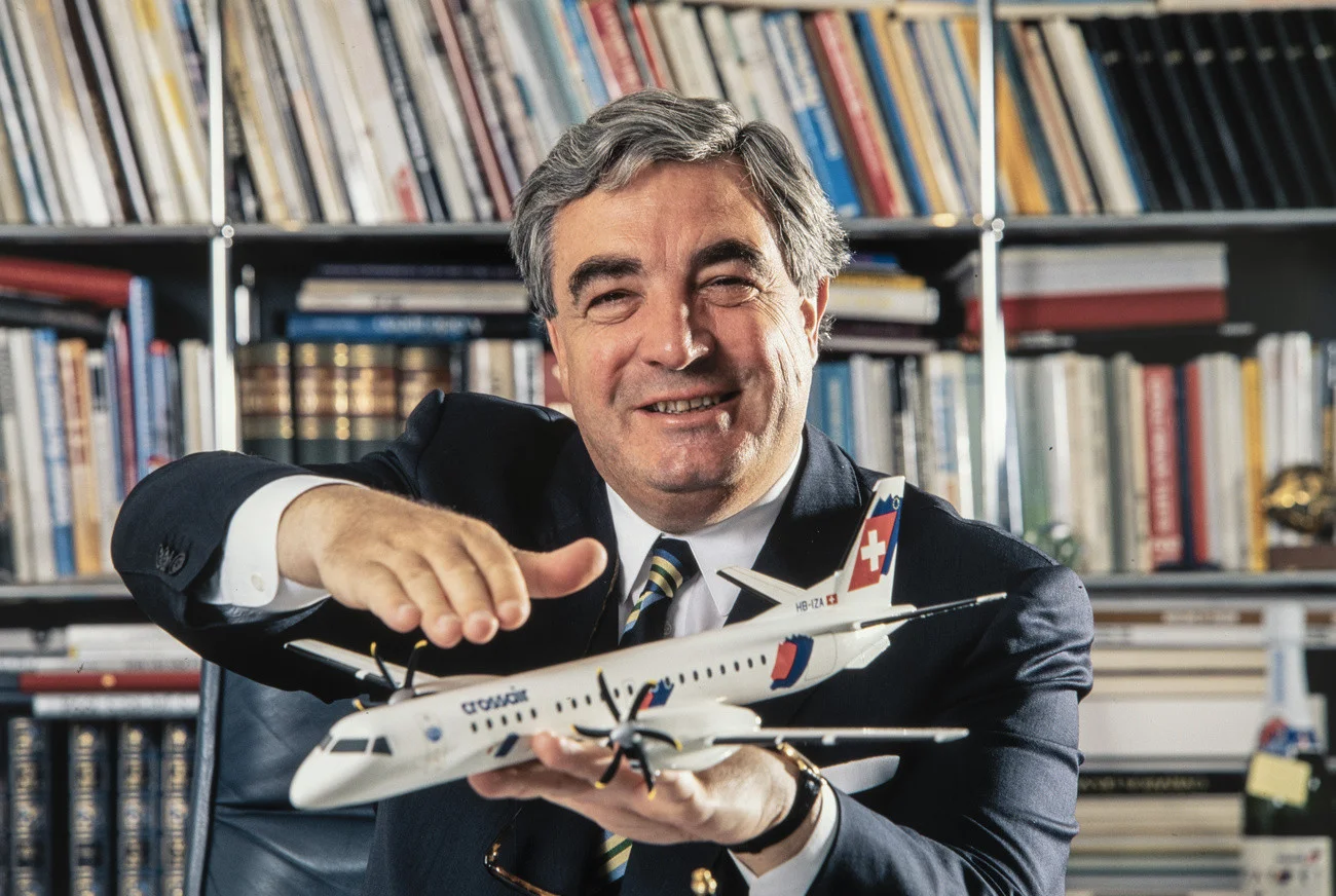 Der Schweizer Unternehmer und Pilot war Gründer der Fluggesellschaft «Crossair». 2001 übernahm er für 44 Tage die in schwere Schwierigkeiten geratene Swissair. 2004 gründete er die in Konkurs gegangene Gesellschaft «Hello». 2010 übernahm er die Basler Zeitung, die er ein Jahr später an die Familie von Christoph Blocher abtritt. Im Bild: Suter 1995 mit einem Model einer Crossair-Maschine (Foto: Keystone/Martin Rütschi)