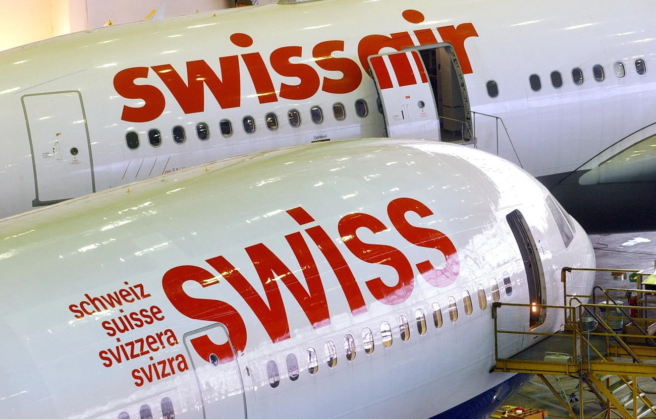 In der Werft der SR Technics (SAir Services) auf dem Flughafen Zürich-Kloten wird ein Flugzeug der Swissair mit dem Schriftzug SWISS überklebt. (Keystone/Steffen Schmidt)