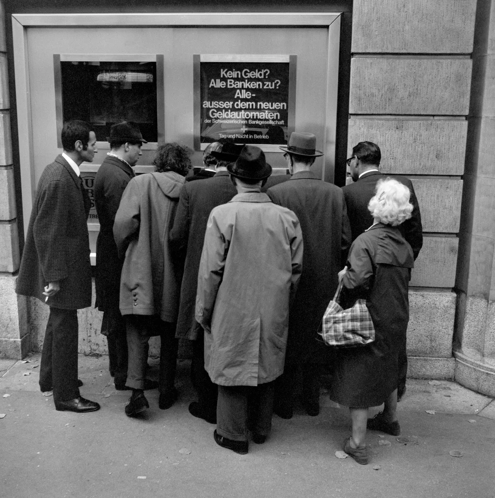 Staunen an der Zürcher Bahnhofstrasse: Neben der Schweizerischen Bankgesellschaft (SBG) wird der erste Geldautomat der Schweiz in Betrieb genommen. Die SBG wirbt mit dem Slogan: «Kein Geld? Alle Banken zu? Alle, ausser dem neuen Geldautomaten.» – Der weltweit erste Geldautomat hatte die Barclays Bank vier Monate vorher, am 27. Juni 1967, in Enfield im Norden Londons eröffnet. (Foto: Keystone/Photopress-Archiv/Ghisleni)