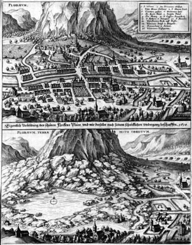 1618: Das Dorf Piuro (deutsch: Plurs) im unteren Bergell wird von einem Bergsturz verschüttet. Zwischen 1’000 und 2’000 Menschen sterben. Das reiche Dorf gehörte damals als Untertanengebiet zu den «Drei Bünden». Wegen des unkontrollierten Abbaus von Speckstein lösten sich am Berg Conto grosse Felsmassen und verschütten das Dorf. Die Bilder aus dem 18. Jahrhundert von Matthäus Merian in der «Topographia Helvetiae» zeigen Piuro vor und nach dem Felssturz.