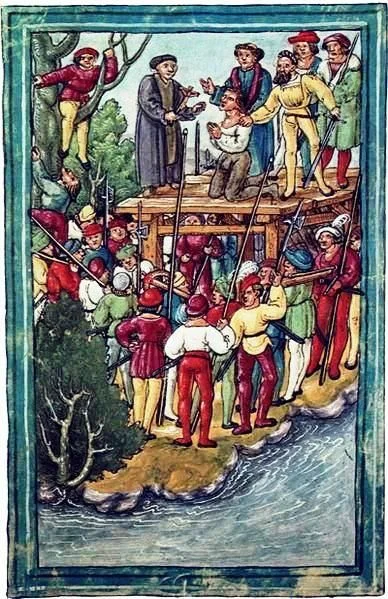 1489: Der Zürcher Bürgermeister Hans Waldmann wird enthauptet. Er war am 1. April 1489 auf Anraten der eidgenössischen Tagsatzungsgesandten und auf Druck der wütenden Menge in den Wellenberg-Turm am Ausfluss des Zürichsees gebracht worden. Durch «fortwährendes Peinigen, Hängen und Strecken», (so eine Chronik) wurde er so gefoltert, dass der Gemarterte «erbermlich schrei und Gott und Maria anruoft in sinen nöten». Nach einem Schnellverfahren wurde das Todesurteil verhängt. Oberhalb des heutigen Bahnhofs Stadelhofen wurde er mit dem Schwert enthauptet. (Bild: Amtliche Luzerner Chronik, 1513, Diebold Schilling, der Jüngere)