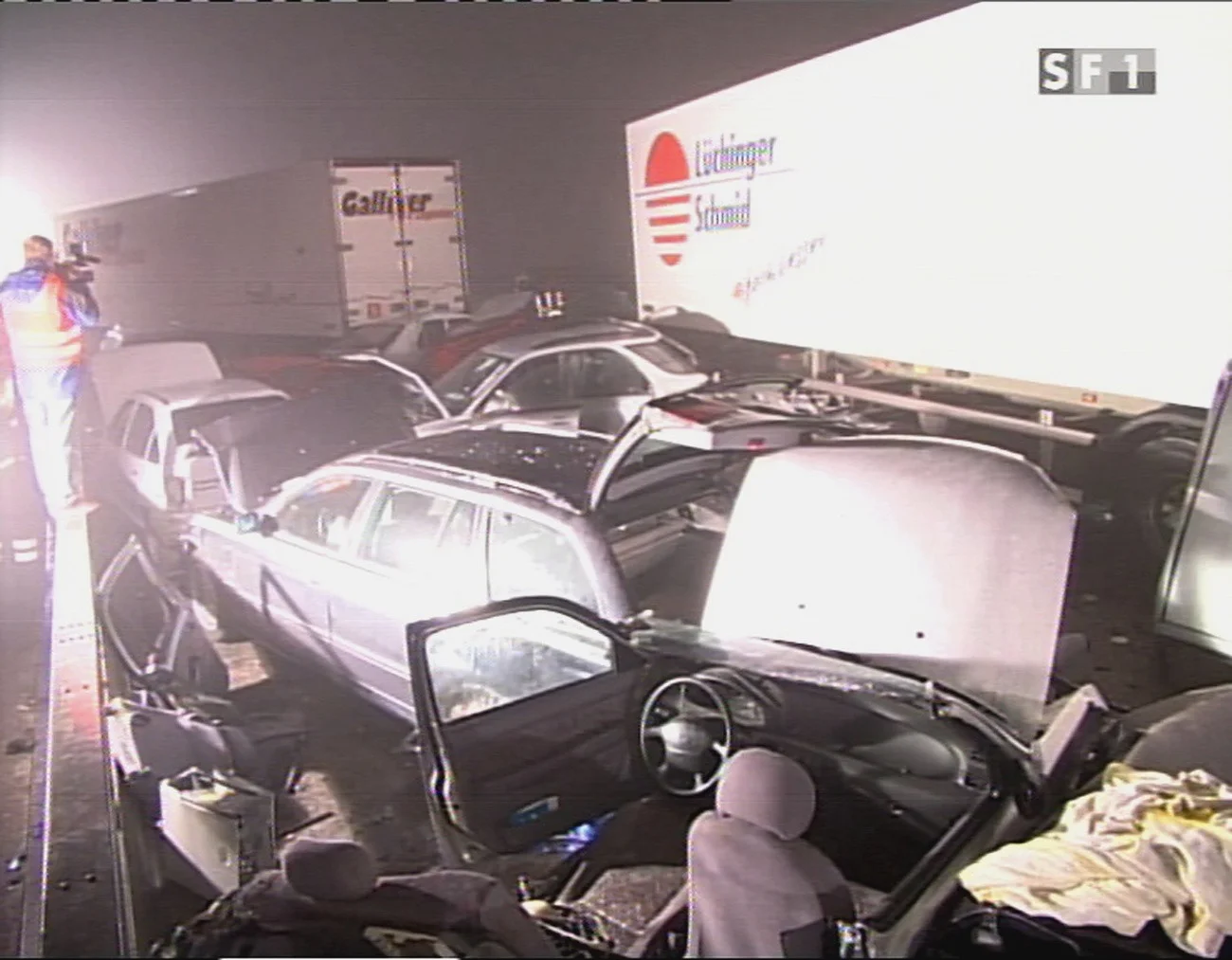 Auf der A1 bei Niederbipp stossen bei dichtem Nebel 65 Fahrzeuge zusammen. Eine Person stirbt, 90 werden verletzt. (Foto. Keystone/Schweizer Fernsehen SF DRS)