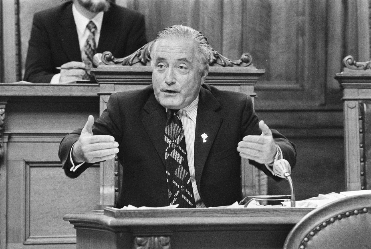 1915: Geburt von Georges-André Chevallaz, Bundesrat von 1973 bis 1983 (FDP/VD). Chevallaz ist von 1957 bis 1973 Stadtpräsident von Lausanne und Vizepräsident der Landesausstellung Expo 64. Als Bundesrat steht er zunächst dem Finanzdepartement vor. Er setzt zahlreiche Massnahmen zur Sanierung der Bundesfinanzen durch. Mit seinem grossen Steuerreformprojekt scheitert er jedoch: Die Einführung einer Mehrwertsteuer wird vom Volk 1977 und 1979 abgelehnt. Als Vorsteher des Militärdepartements plant er die Anschaffung eines neuen Sturmgewehrs und des Kampfpanzers Leopard. Er überwacht auch die Neuorganisation der Geheimdienste, so der Widerstandsorganisation P-26. 1992 kämpft er gegen den Beitritt der Schweiz zum EWR. Er stirbt am 8. September 2002. Im Bild: Chevallaz am 25. Oktober 1974 im Bundeshaus in Bern. (Keystone/Photopress-Archiv)