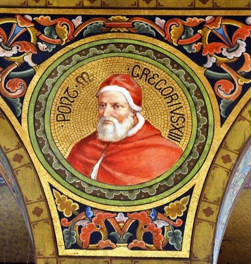 1502: Geburt in Bologna von Papst Gregor XIII. Mit einer Kalenderreform führt er 1582 den heute gültigen «gregorianischen Kalender» ein, der den julianischen Kalender ablöst. Gregor fördert die Wissenschaft und die Bildung und ist ein harscher Kämpfer gegen die Protestanten. Die Pariser «Bluthochzeit» (Bartholomäusnacht), bei der Hunderte Protestanten (Hugenotten) massakriert werden, billigt er ausdrücklich. Er stirbt am 10. April 1585 in Rom. (Fresko in der Basilica San Paolo fuori le Mura in Rom)