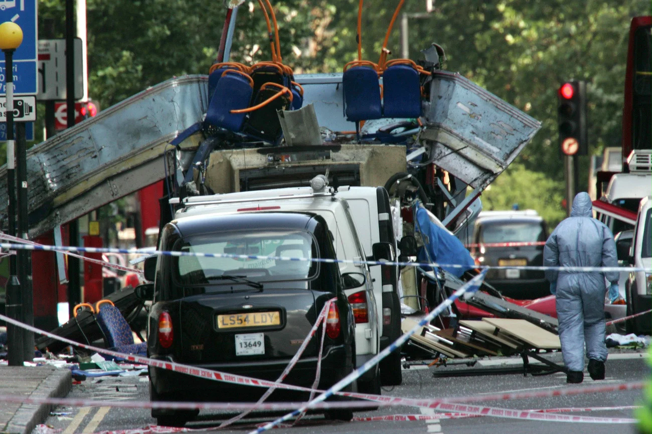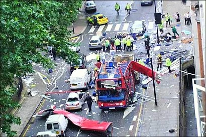 2005: Islamistische Attentate in drei Londoner U-Bahnen und einem Doppeldecker-Bus (siehe oben).