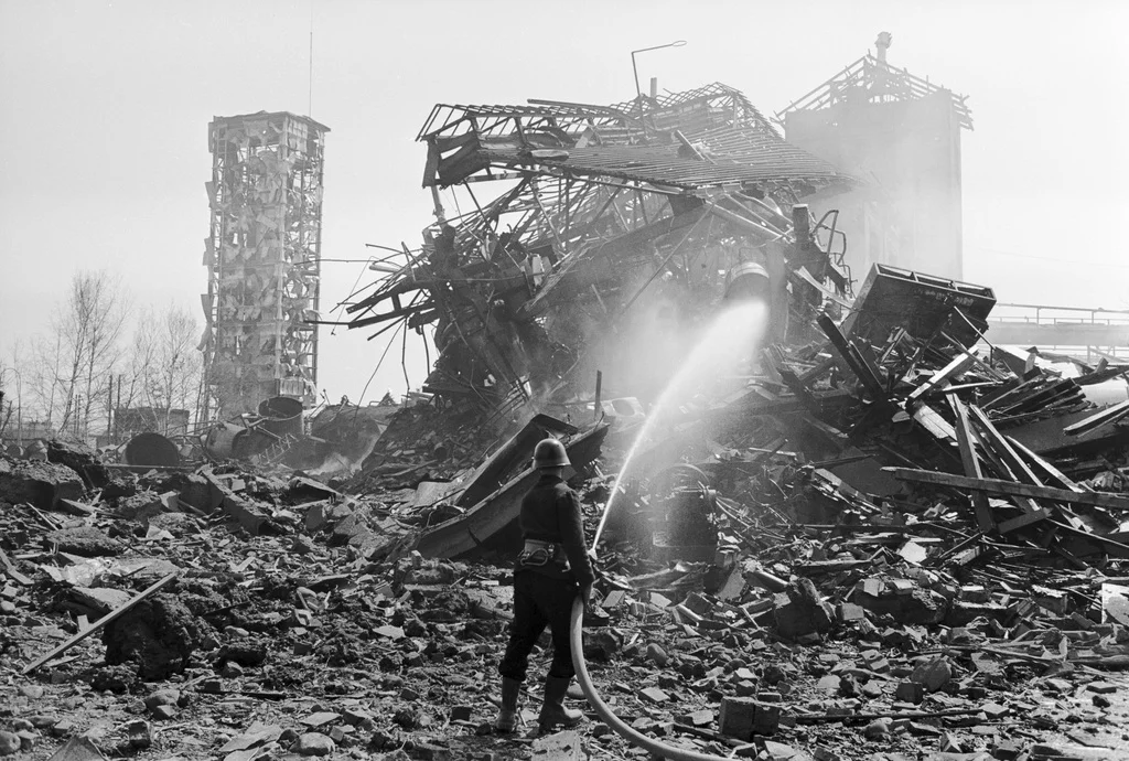 8. April 1969: In der Schweizerischen Sprengstofffabrik Dottikon (SSF), der «Pulveri», im Kanton Aargau ereignet sich am Osterdienstag um 7.17 Uhr eine Explosion. 18 Menschen sterben. Die Detonation ist im Umkreis von bis zu 20 Kilometern zu hören. 400 Personen befinden sich zur Zeit des Explosion in der Fabrik. 1300 Gebäude in Dottikon, Dintikon, Hägglingen, Villmergen und Wohlen werden beschädigt. Der Schaden auf dem Firmengelände beläuft sich auf 8,5 Mio. Franken. Als Ursache des Unglücks wird eine Fehlmanipulation mit flüssigem Trotyl vermutet. Im Bild ein Feuerwehrmann nach der Explosion. (Foto: Keystone/Str)