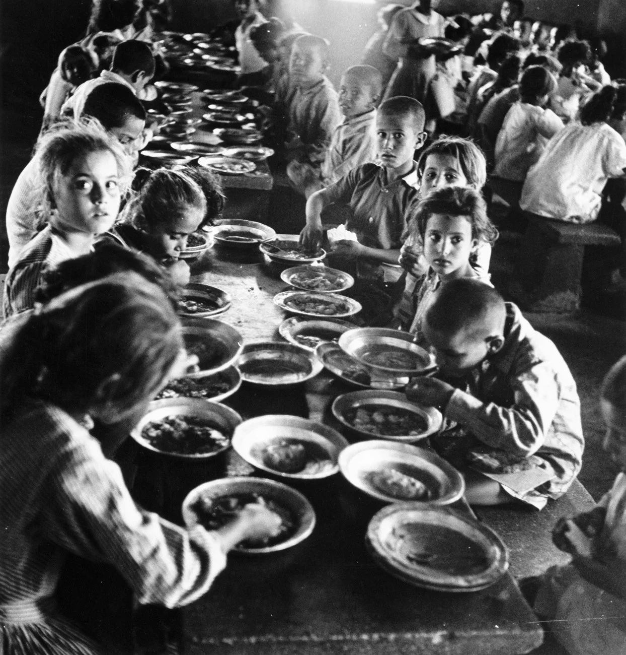 Das Bild entstand im Jahr 1970 und zeigt eine der drei Essensstellen in Rafah. Damals verteilte das UNRWA an sechs Tagen in der Woche täglich eine warme Mahlzeit an Kinder bis zu fünfzehn Jahren und an Schwangere.