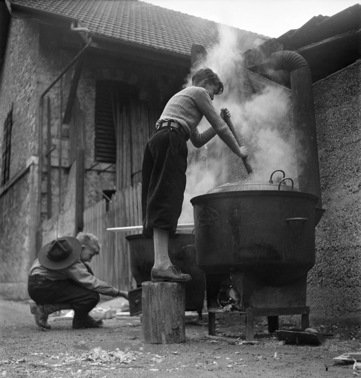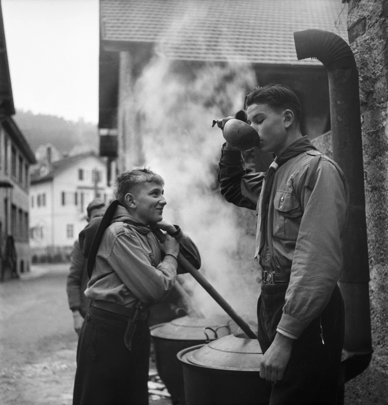 Weihnachten 1949: Pfadfinder in Biel kochen in einer Gassenküche eine kräftige Suppe, die sie dann bedürftigen Kindern verteilen. (Foto: Keystone/Ernst Baumann)