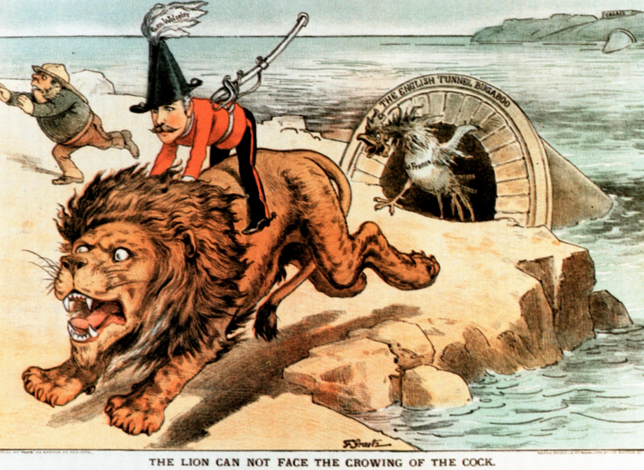 Der gallische Hahn steigt krächzend aus der Tunnelröhre. Der stolze britische Löwe flüchtet. Die 1885 im amerikanischen Satire-Magazin «Puck» erschienene Karikatur illustriert die britischen Ängste vor einem Tunnel unter dem Ärmelkanal. Auf dem flüchtenden Löwen sitzt Garnet Wolseley, der Oberbefehlshaber der britischen Armee. Trotz britischer Bedenken wurden der Eurotunnel dann doch gebaut und vor dreissig Jahren eingeweiht.