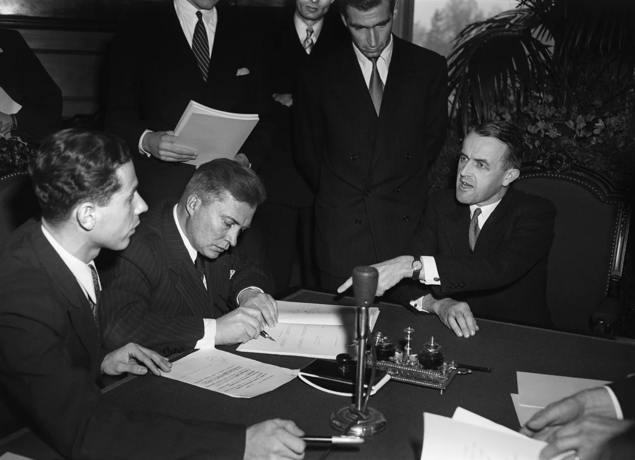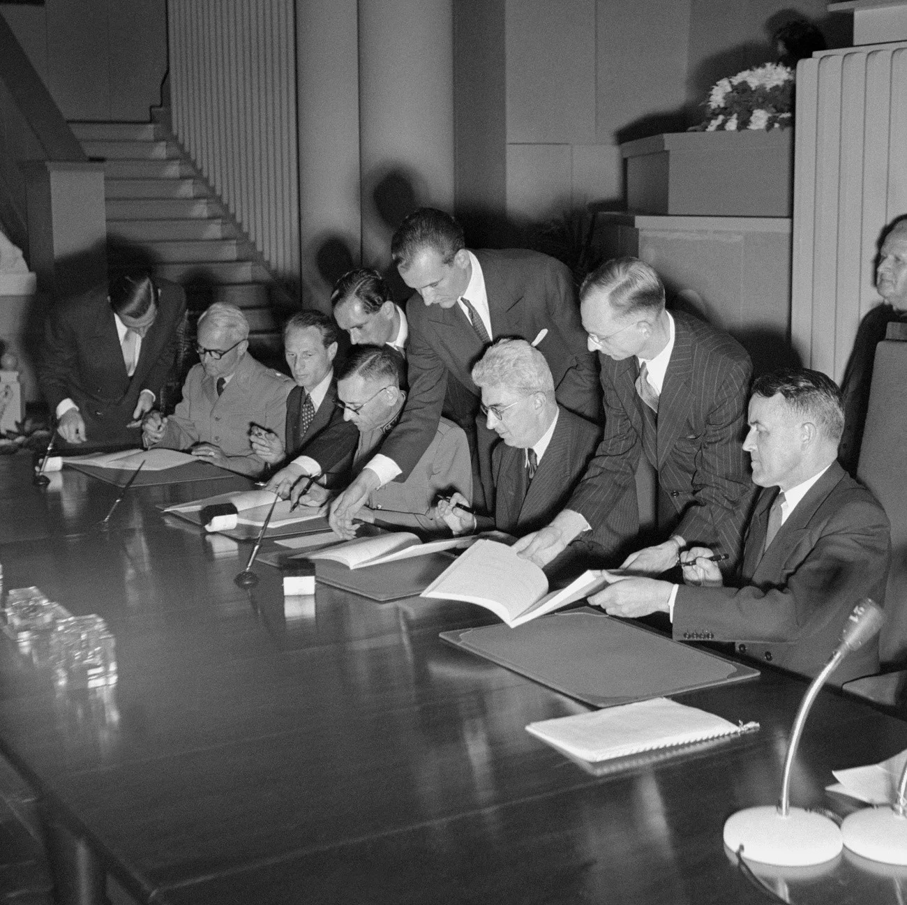 Vor 75 Jahren werden im Genfer Palais des Nations die heute gültigen vier Genfer Konventionen geboren. Sie bilden die Grundlage des humanitären Völkerrechts und stellen Regeln für den Kriegsfall auf. 196 Nationen haben die Konventionen unterzeichnet, auch heute kriegsführende Staaten wie Russland, die Ukraine, Israel und Iran. Im Bild die Schweizer Delegation bei der Unterzeichnung des Vertragswerks.